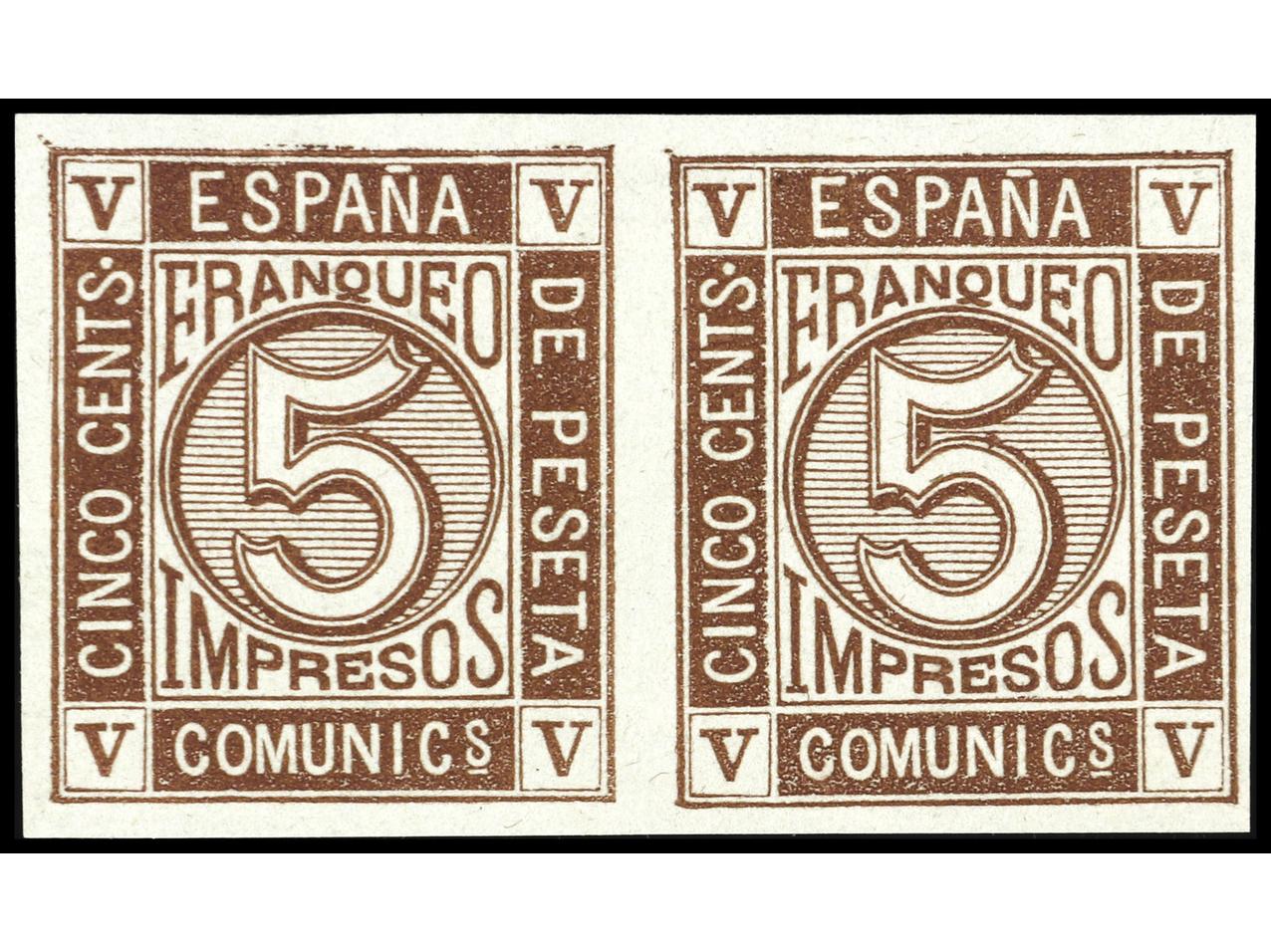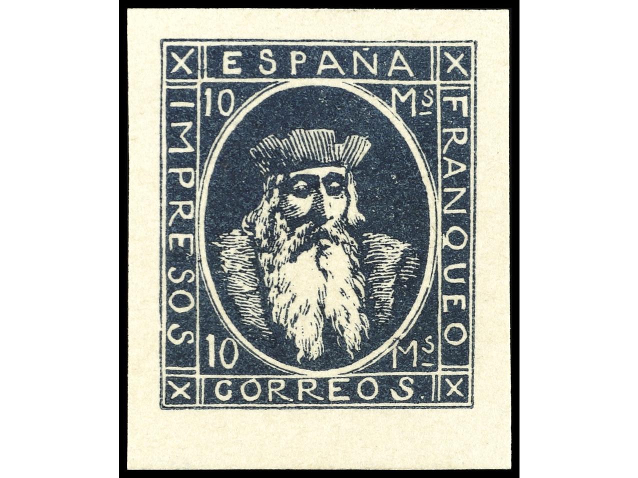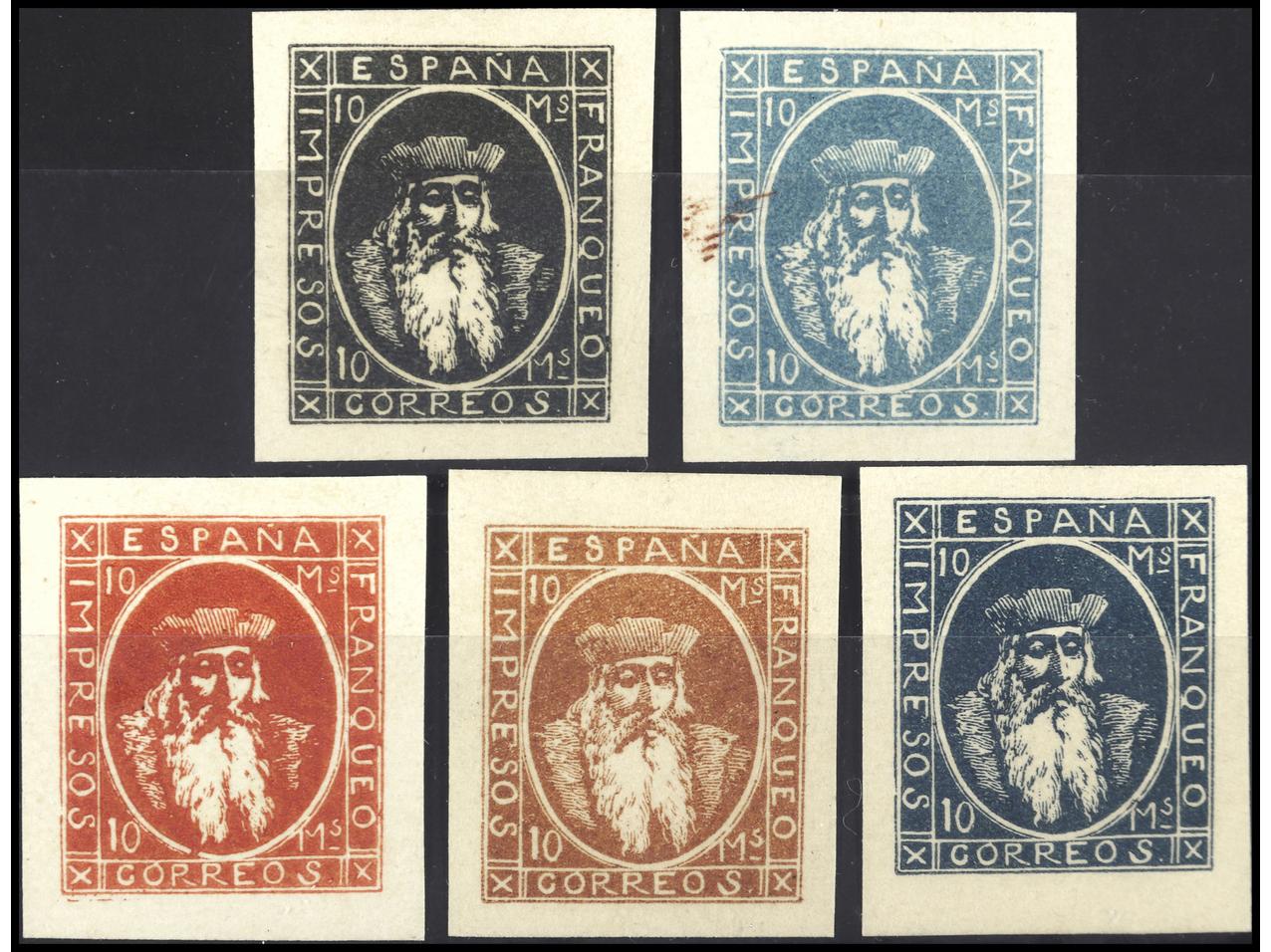 ESPAÑA. 5 PRUEBAS de 10 mils. con leyenda IMPRESOS ESPAÑA FRANQUEO CORREOS. Origen desconocido. PRECIOSAS. MUY RARAS. (Image1) (Image2)