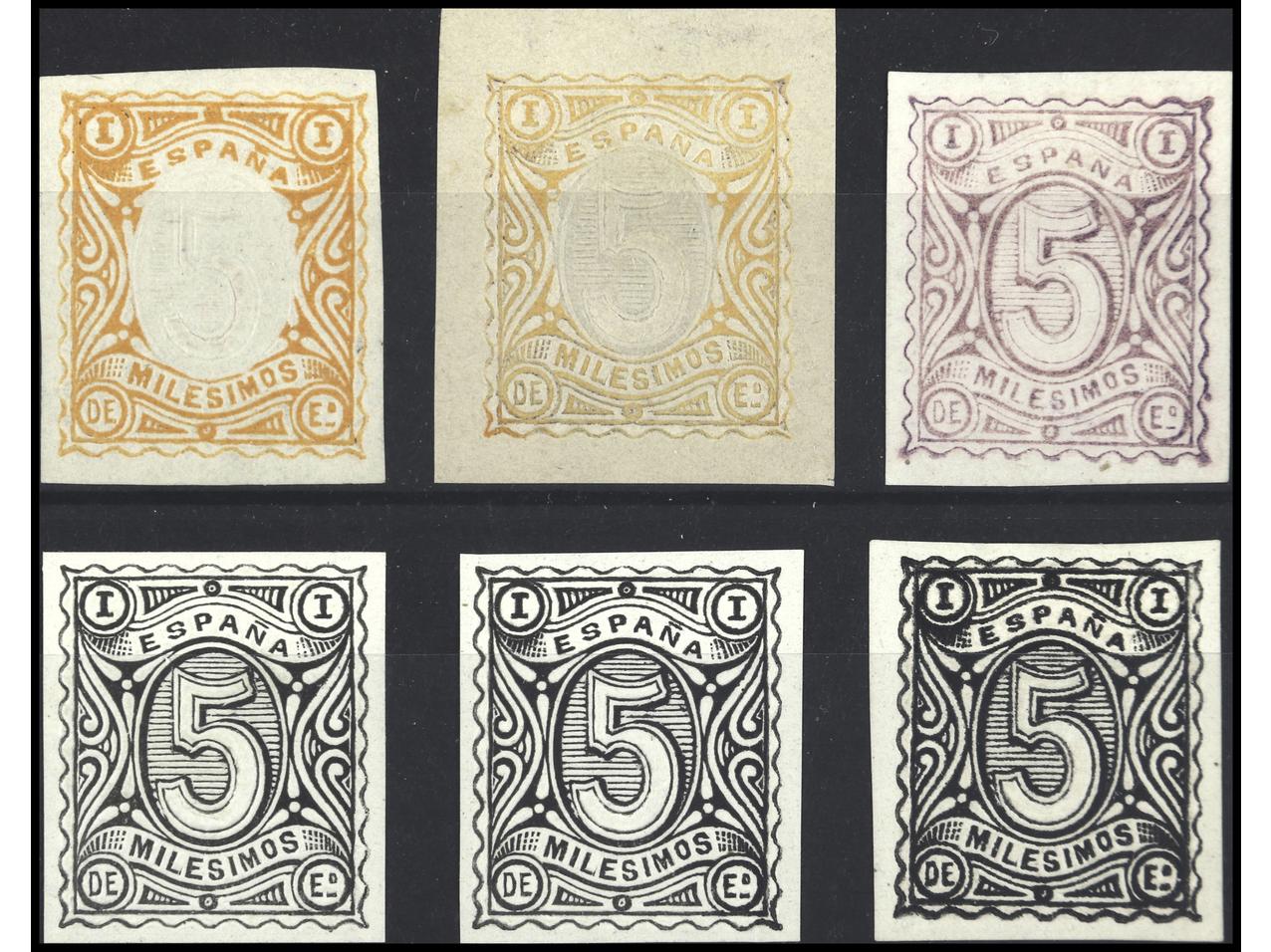 ESPAÑA. 1870. 6 PROYECTOS NO OFICIALES de mils. de autor desconocido, suponiendo de origen italiano. Algunas impresas en relieve. PRECIOSAS. MUY RARAS.