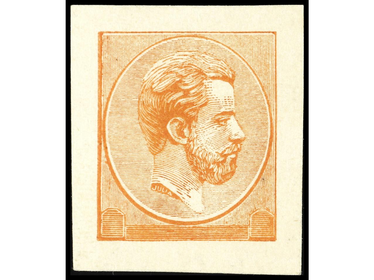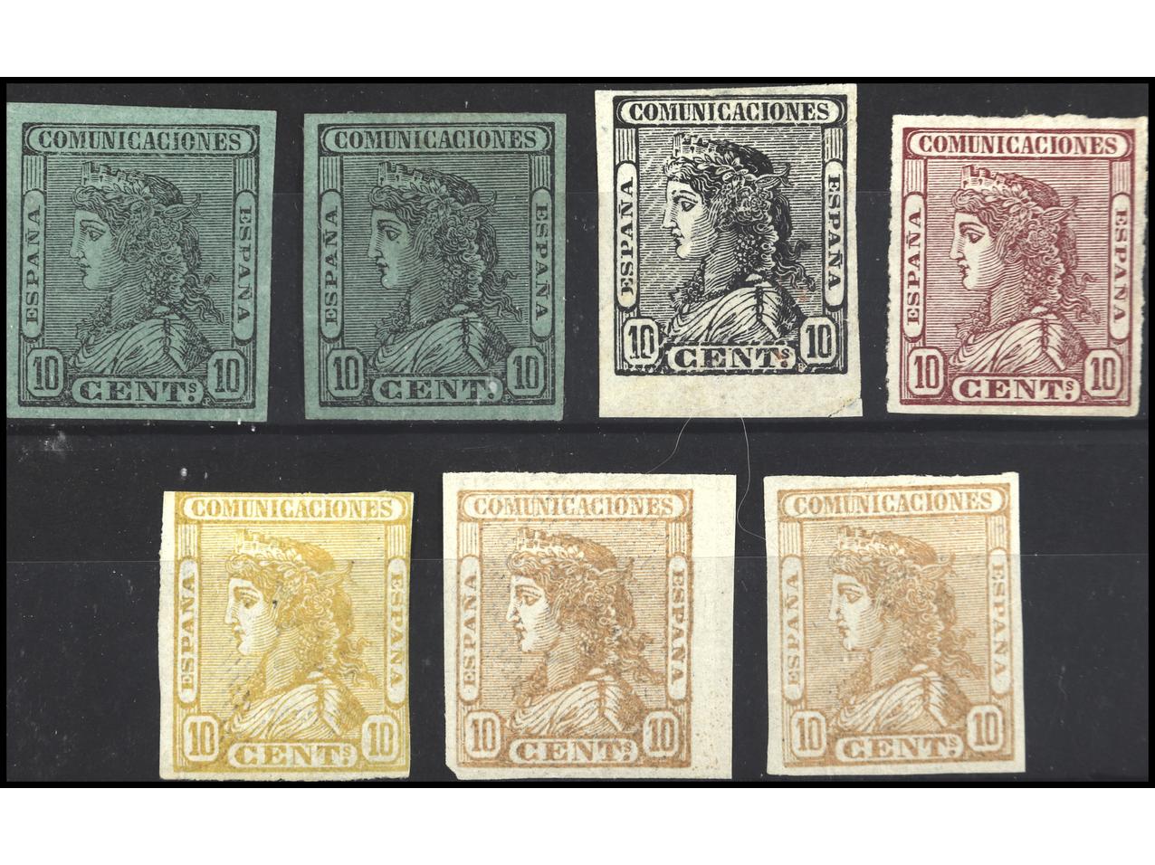 ESPAÑA. 1874. 7 ENSAYOS DE PLANCHA grabados por Luis Plañol. Todos son de 10 cts. y varios colores, algunos con papel con la filigrana de la emisión de 1875 de Alfonso XII. BONITOS. RAROS. A EXAMINAR. (Image1)