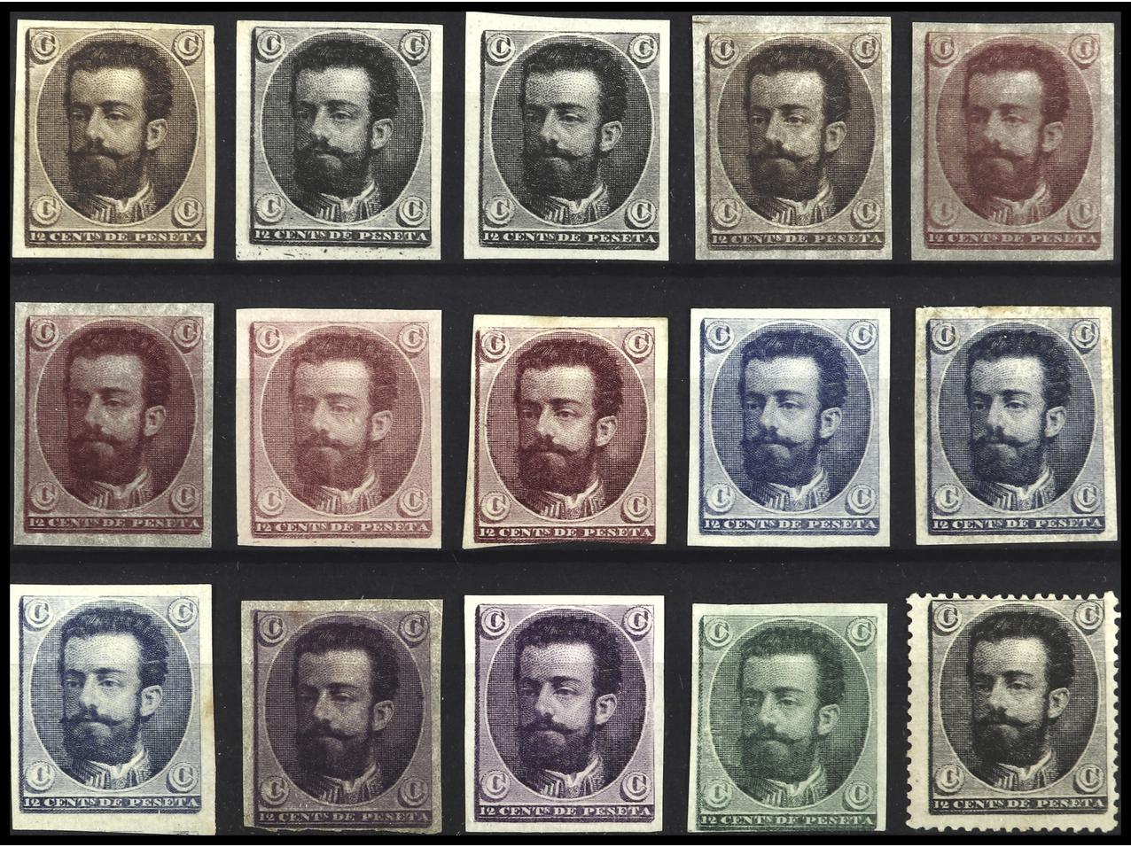 ESPAÑA. ENSAYOS DE PLANCHA. Proyectos de Pascual Alegre. 15 PRUEBAS diferentes de 12 cts. (Gálvez 844/50). PRECIOSAS. RARAS. (Image1)