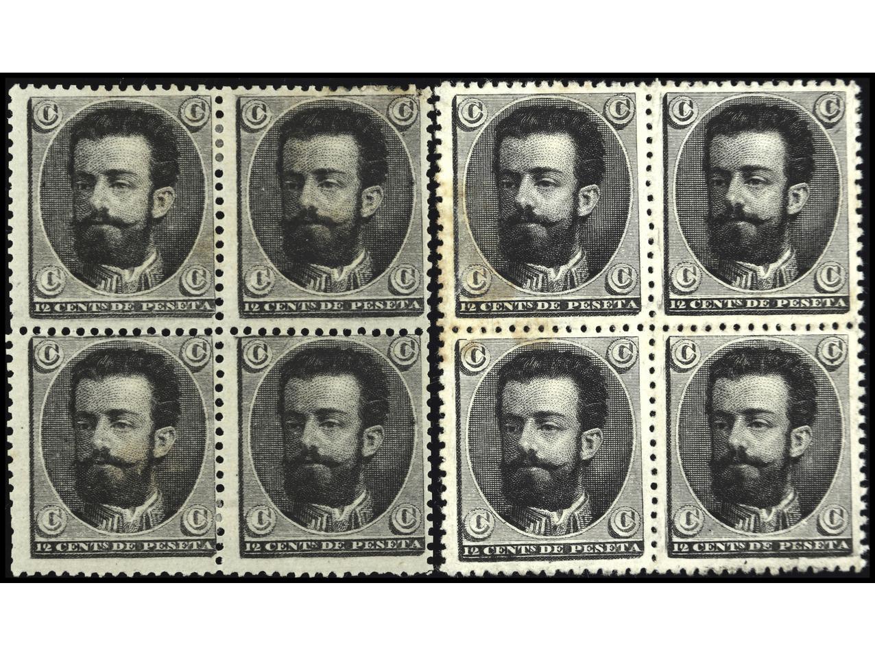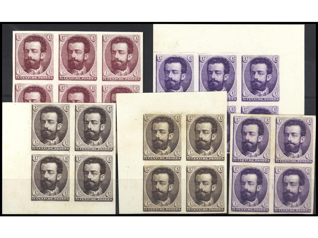 ESPAÑA. ENSAYOS DE PLANCHA de 12 cts. sobre cartulina blanca y SIN DENTAR. 3 Bloques de 4 y 2 bloques de 6 (Gálvez 838/40). PRECIOSOS. RAROS.