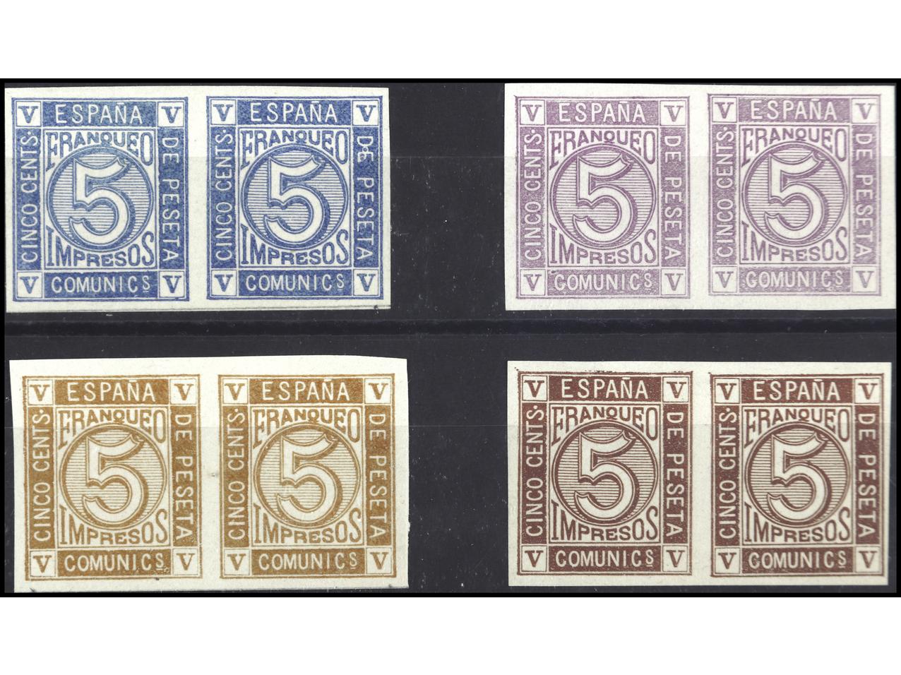 ESPAÑA. 5 cts. ENSAYOS DE PLANCHA. 4 Parejas en colores diferentes (Gálvez 771 y 773/5). PRECIOSAS. RARAS. Ed.147P. (Image1) (Image2)