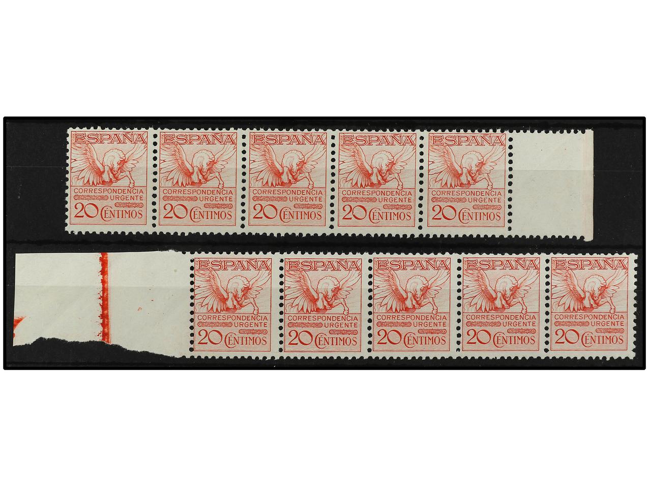 ESPAÑA. 20 céntimos rosa. 2 tiras de 5. Centrados variados. EXAMINAR. Ed.592A. Cat. 1.300€. (Image1)