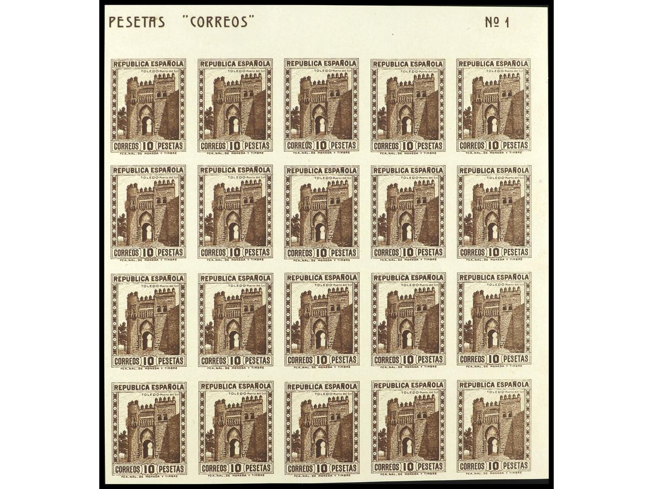 ESPAÑA. 10 pts. castaño en bloque de 20 SIN DENTAR. Esquina de pliego. Buena calidad. Ed.675s(20). Cat. 250€. (Image1)