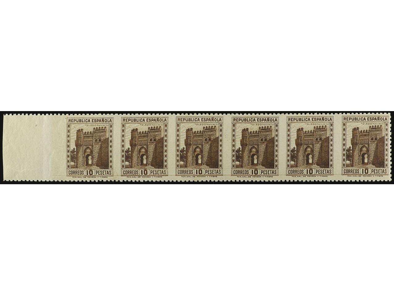 ESPAÑA. 10 pts. castaño. Tira horizontal de 6 SIN DENTADO VERTICAL, UN SELLO DENTADO POR TRES LADOS. Ed.772 var. (6). (Image1)