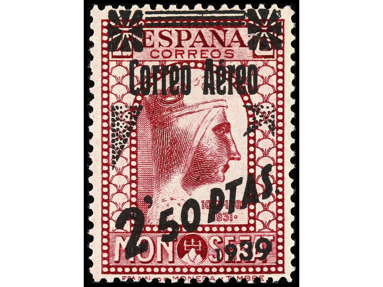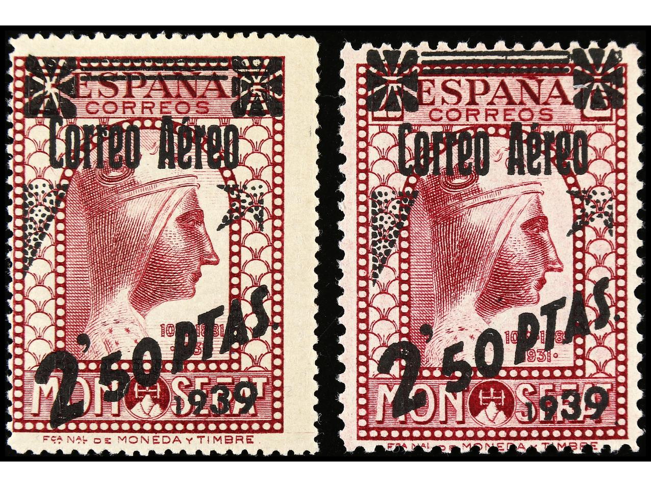 ESPAÑA. 2,50 pts. s. 25 cts. lila rosáceo. 2 sellos (dent. 14 y 11 1/4) con habilitacion CORREO AÉREO 1939. Ed.791FN y FNa. Cat. +220€. (Image1) (Image2)