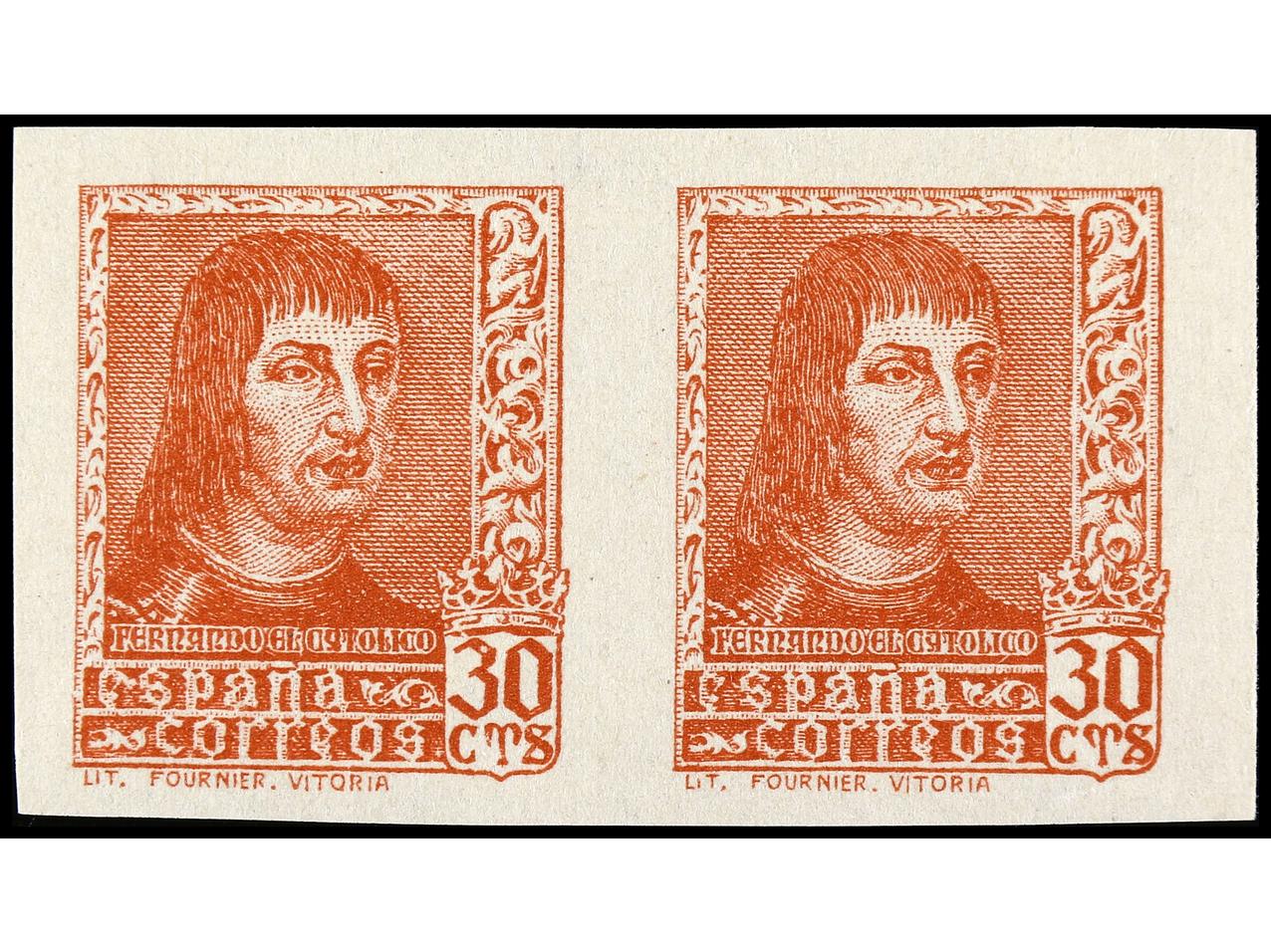 ESPAÑA. 30 cts. rojo con pie de imprenta ´LIT. FOURNIER-VITORIA´ en pareja SIN DENTAR. LUJO. Ed.844As (2). Cat. 150€. (Image1)