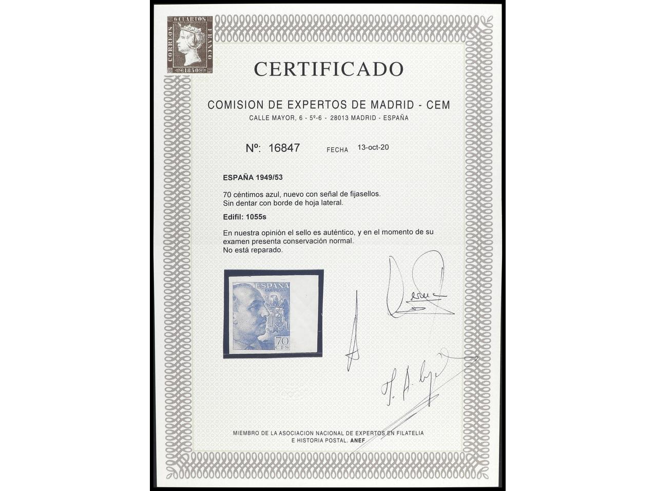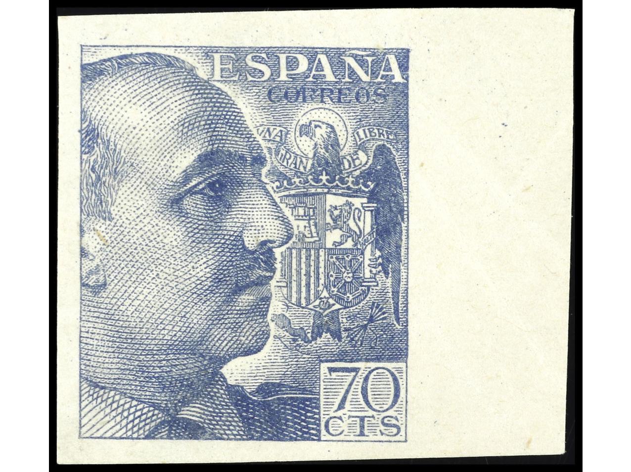 ESPAÑA. 70 cts. azul SIN DENTAR con borde lateral de hoja. Es más raro que el 35 cts. Cert. CEM. PRECIOSO. Ed.1055s. (Image1) (Image2)