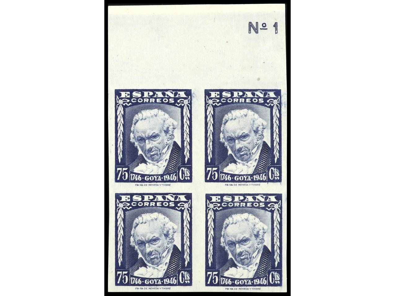 ESPAÑA. 75 cts. ultramar SIN DENTAR. Preciosa variedad de color en bloque de 4. Borde superior de hoja. RARA. Ed.1007as(4). (Image1)