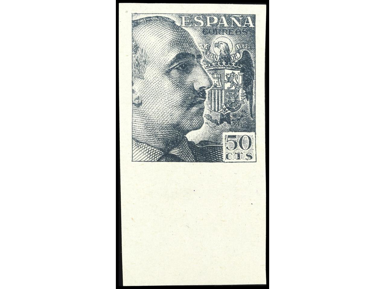 ESPAÑA. 50 cts. azul oscuro SIN DENTAR con borde inferior de hoja. Cert. CEM. PRECIOSO. MUY RARO. Ed.1053s. (Image1) (Image2)