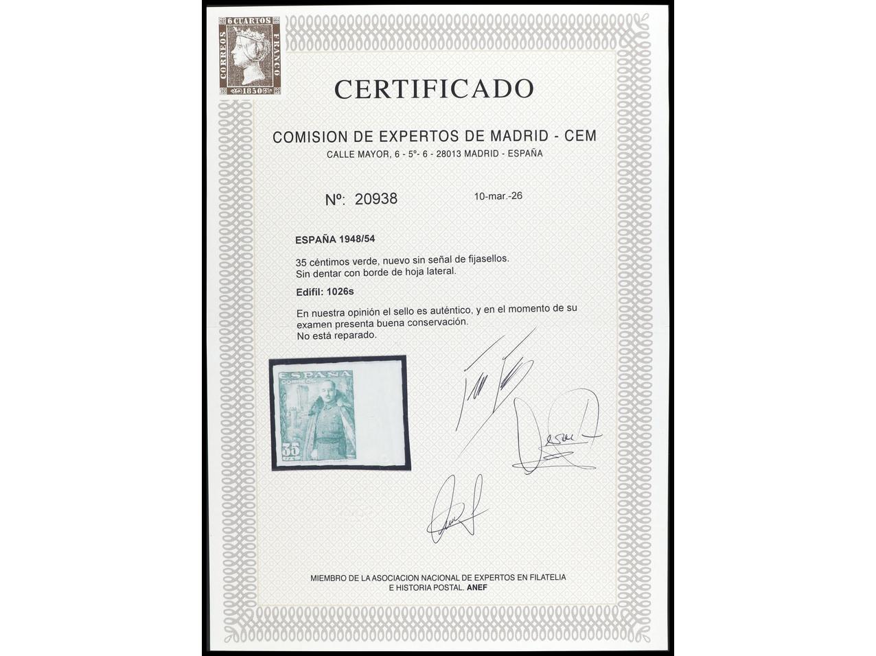 ESPAÑA. 35 cts. verde SIN DENTAR con borde lateral de hoja. Cert. CEM. PRECIOSO. MUY RARO. Ed.1026s. (Image1) (Image2)