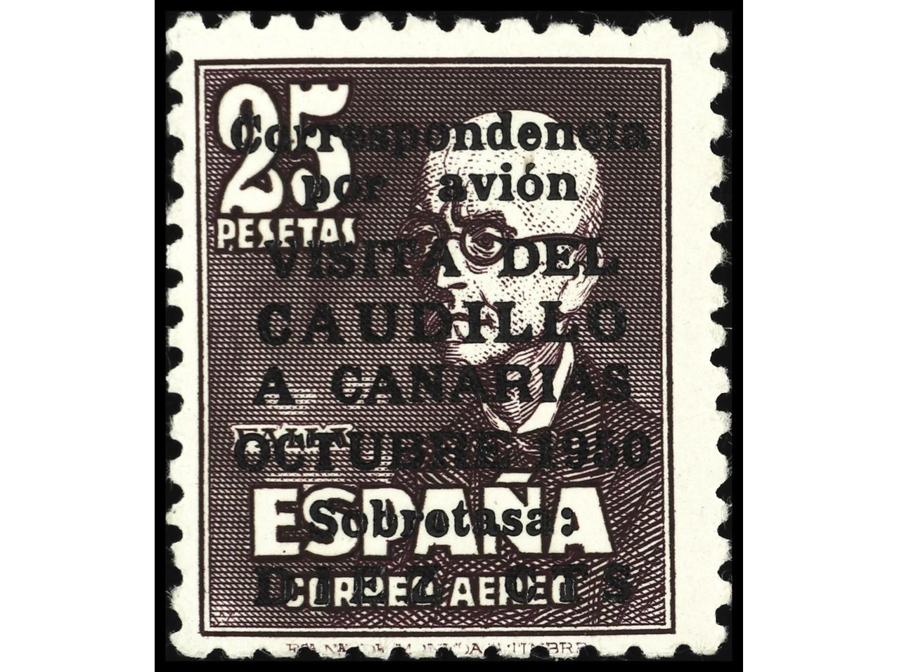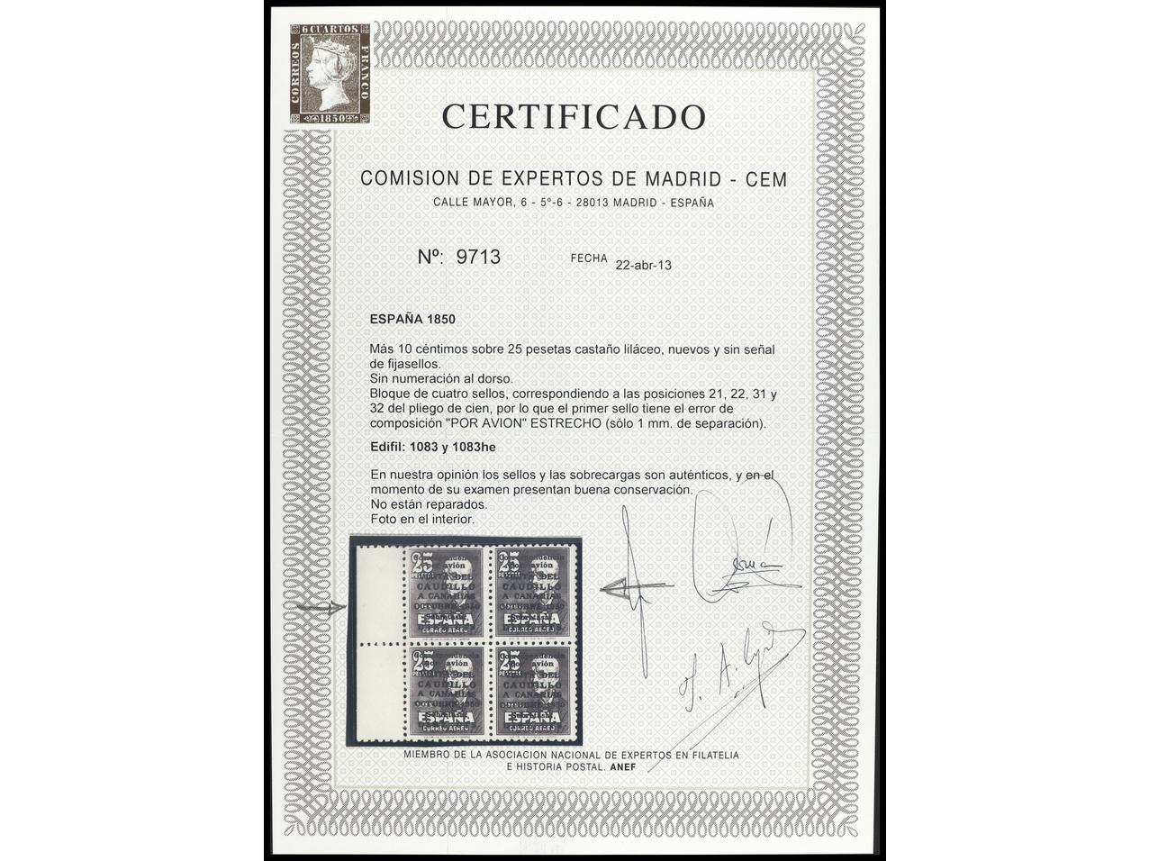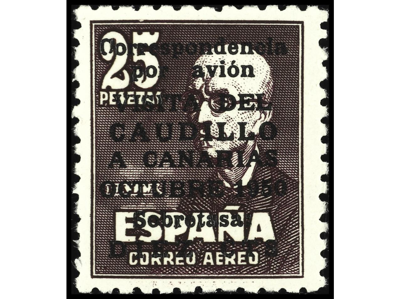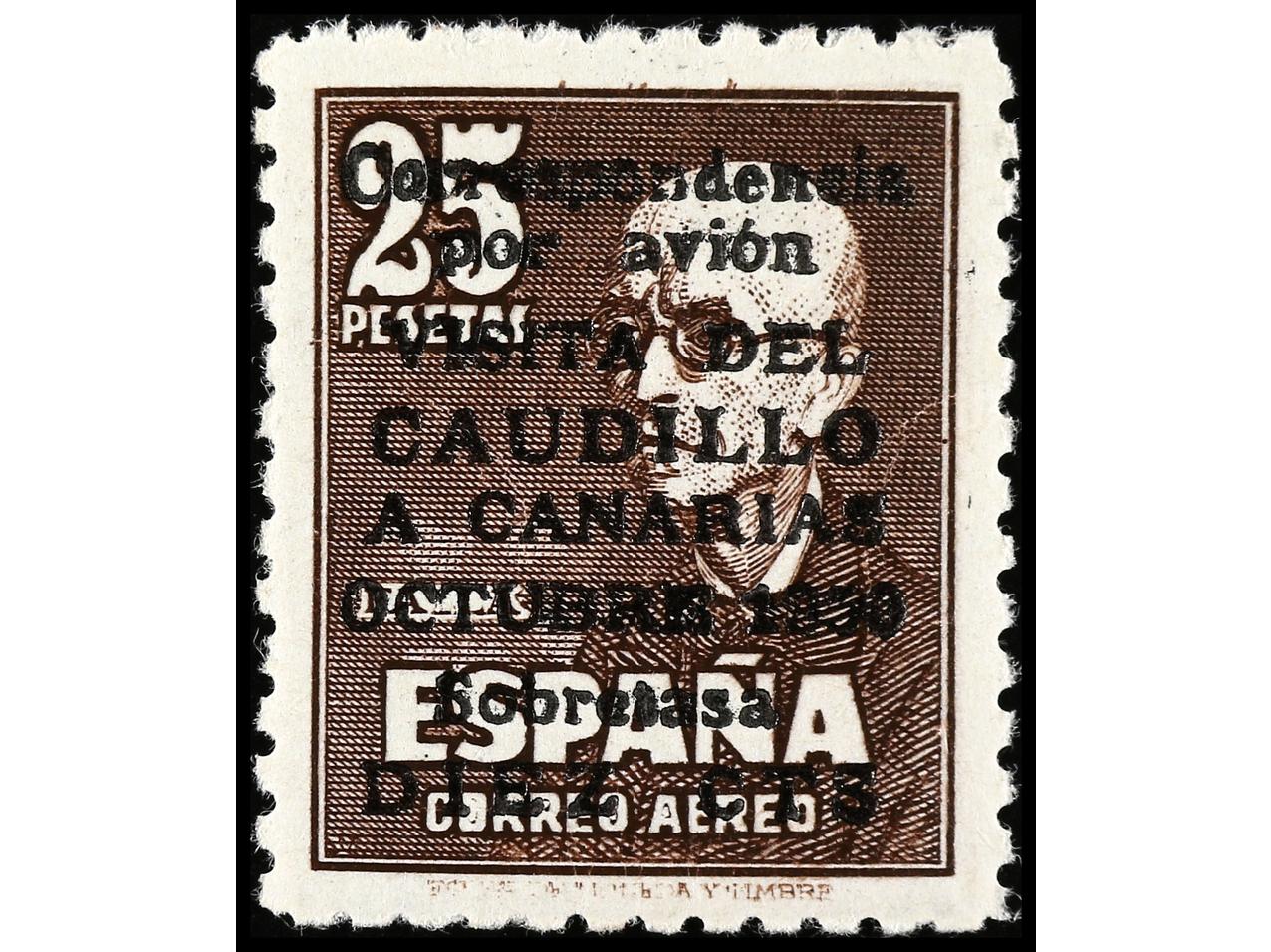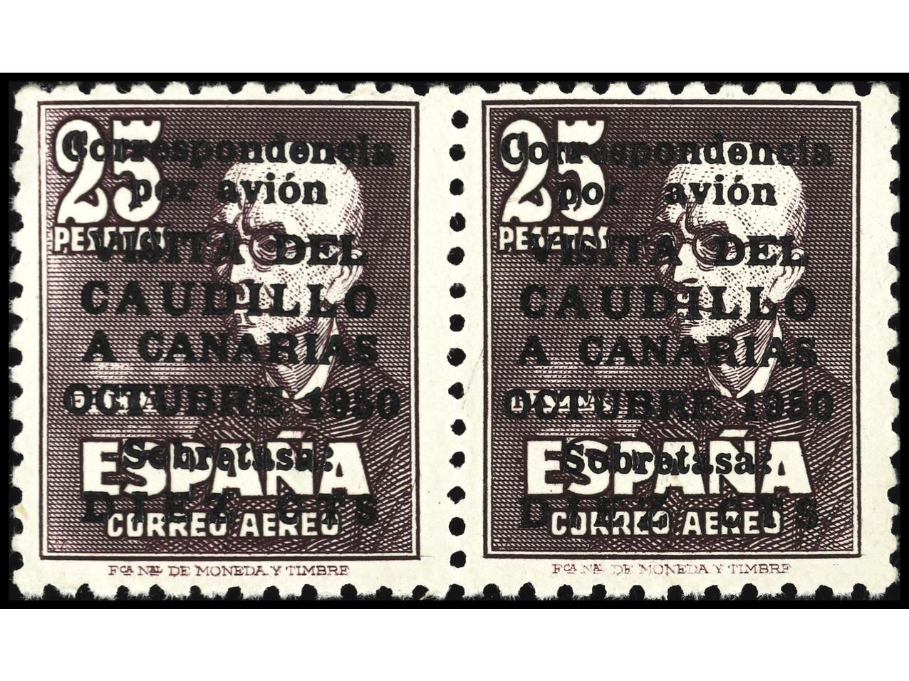 ESPAÑA. CAUDILLO A CANARIAS SIN NUMERO. Pareja horizontal con el error 1 MM. DE SEPARACIÓN ENTRE LAS PALABRAS ´POR´ Y ´AVIÓN´ y el otro normal (2 1/2 mm.). Muy bien centrada. Cert. CEM. PRECIOSA. MUY RARA. Ed.1083he + 1083. (Image1) (Image2)