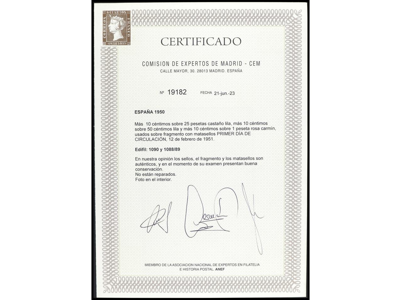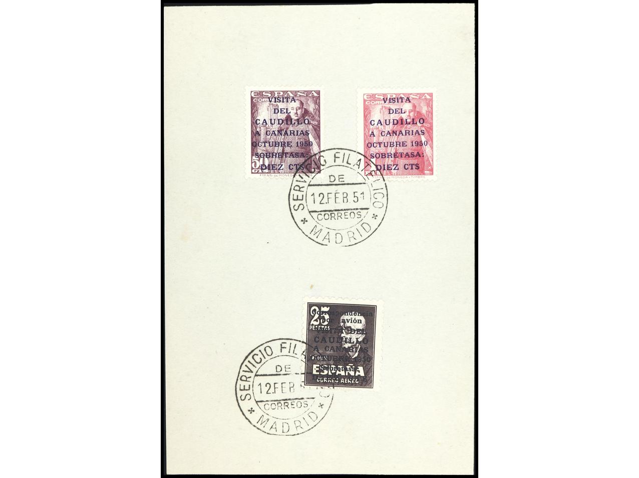 ESPAÑA. CAUDILLO A CANARIAS. SERIE COMPLETA y con número sobre fragmento con Mat. PRIMER DÍA. Cert. CEM. PRECIOSO. RARO. OCASIÓN. Ed.1088/9 y 1090.
