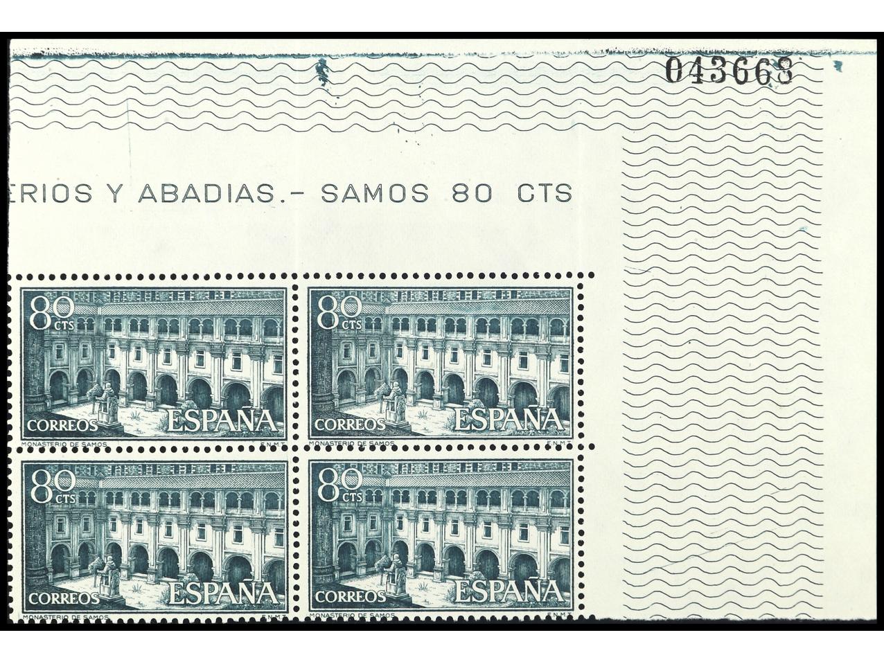 ESPAÑA. MONASTERIO DE SAMOS. 80 cts. verde. UNICOLOR. Bloque de 4 con esquina de pliego. PRECIOSO. RARO. Ed.1322ef(4). (Image1)