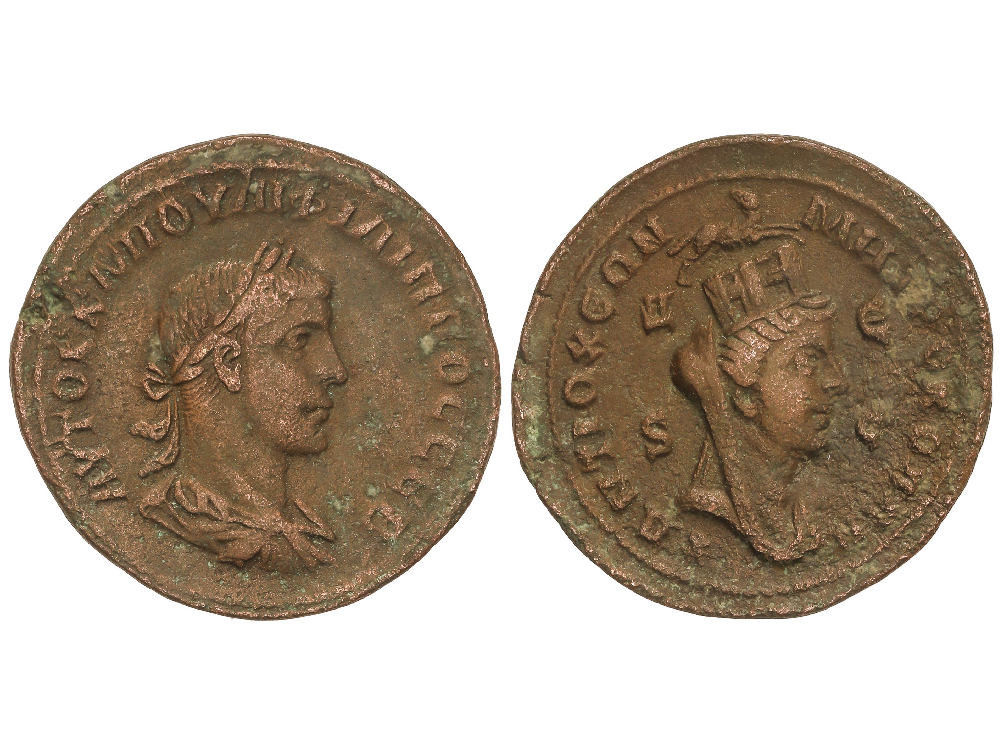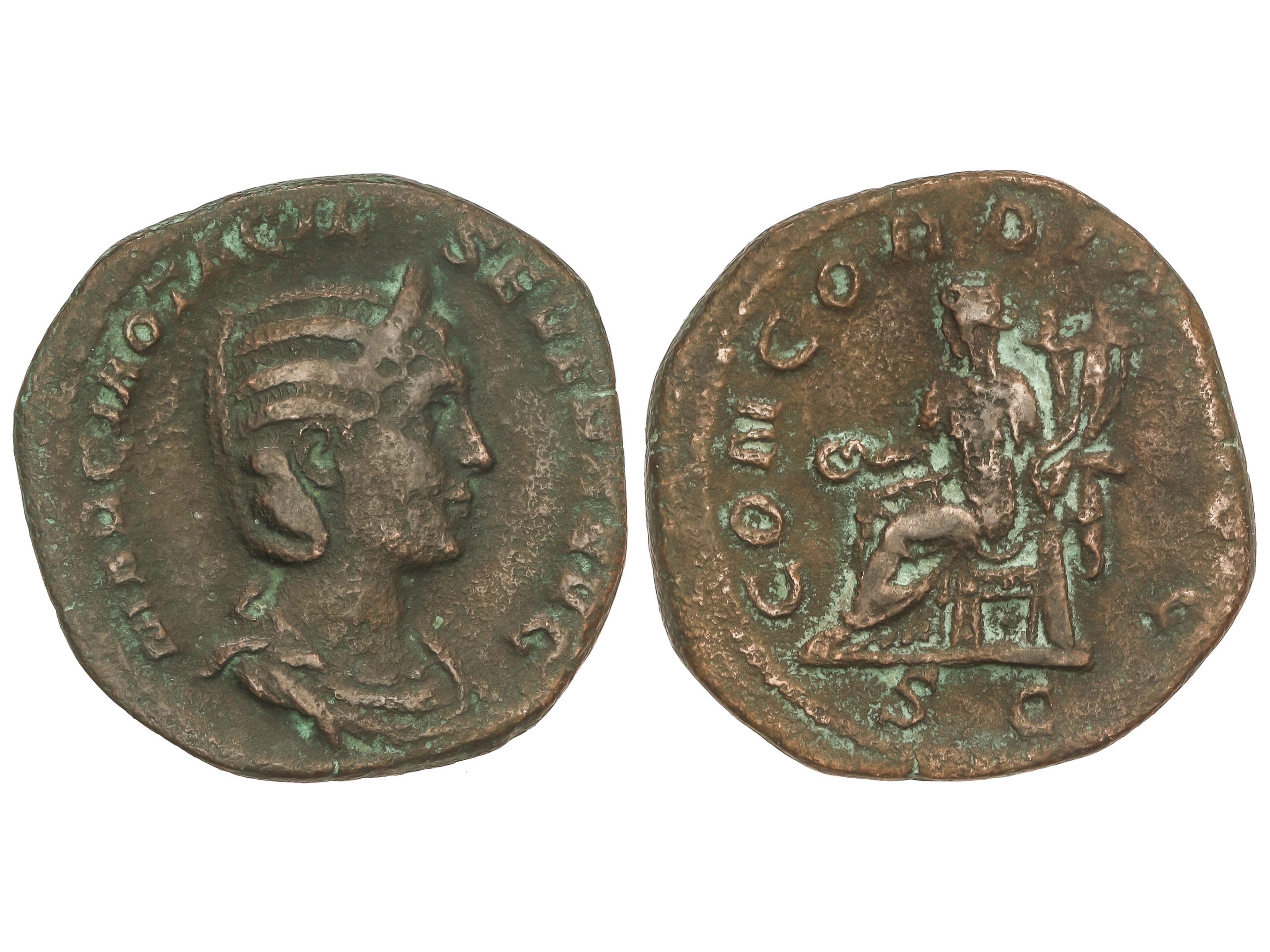 Sestercio. 244-249 d.C. OTACILIA SEVERA. Anv.: MARCIA OTACIL. SEVERA AVGG. Busto diademado a derecha. Rev.: CONCORDIA AVGG. S. C. Concordia sentada a izquierda con pátera y cornucopia. 17,35 grs. AE. C-10.