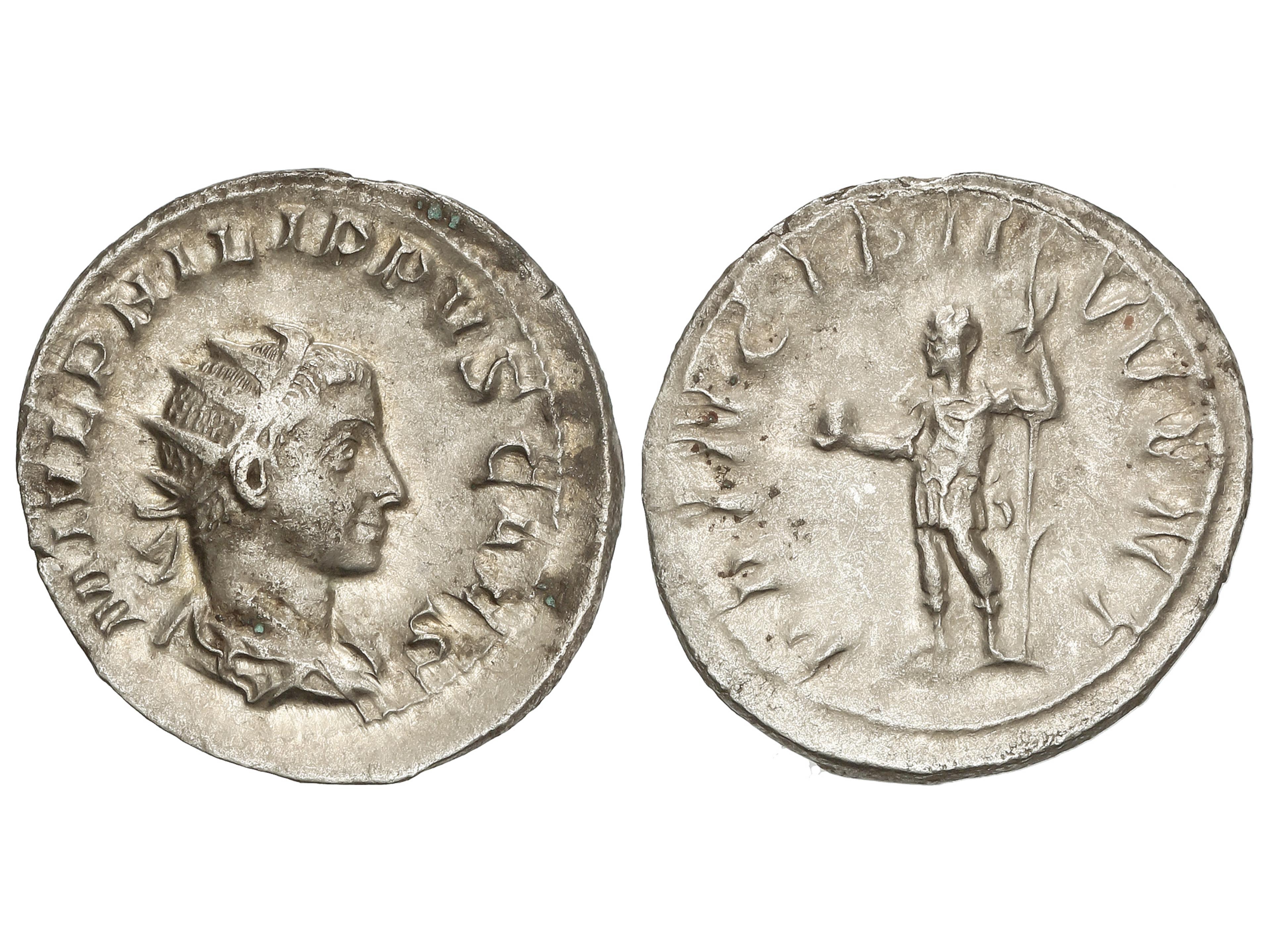 Antoniniano. 244-246 d.C. FILIPO II. Rev.: PRINCIPI IVVENT. Filipo II en pie a izquierda con globo y lanza. 3,33 grs. AR. (Leves oxidaciones). C-48. MBC+. (Image1)