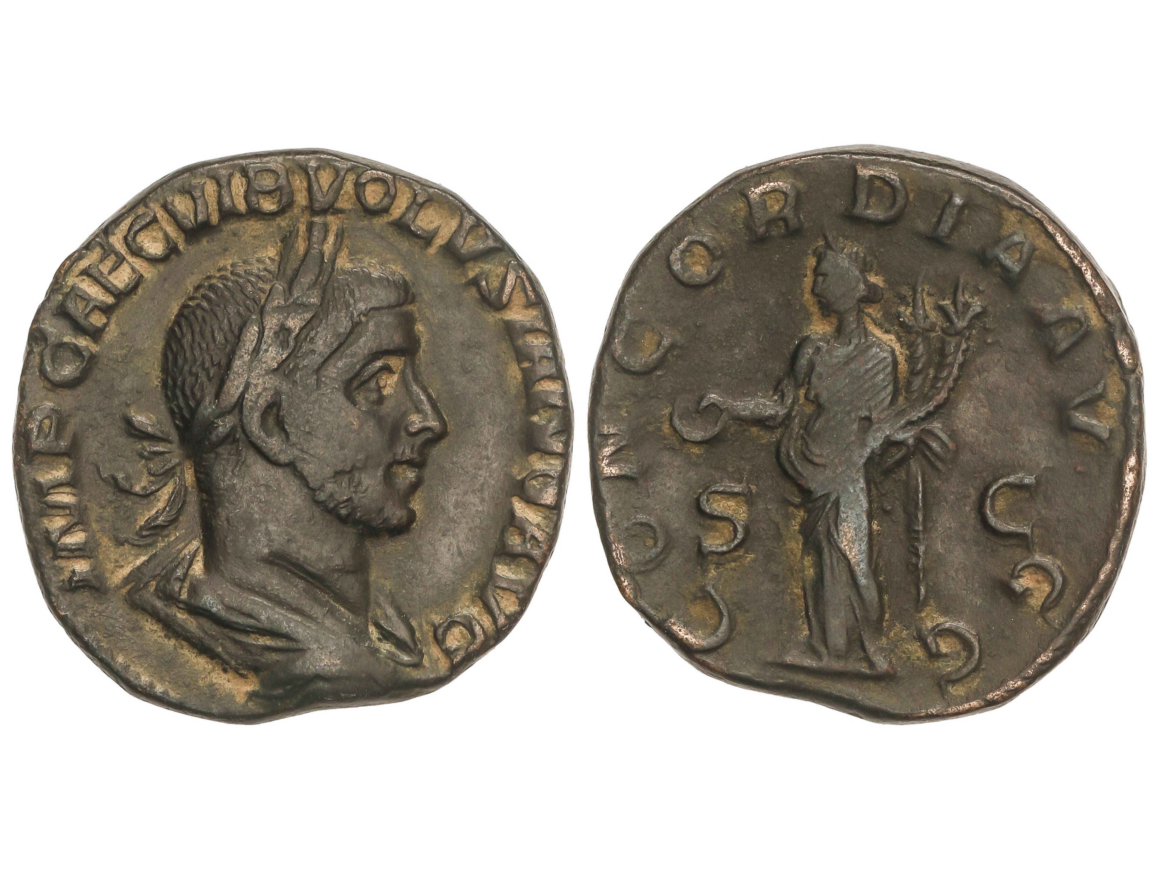 Sestercio. 251-253 d.C. VOLUSIANO. Anv.: IMP. CAE. C. VIB. VOLVSIANO AVG. Busto laureado a derecha. Rev.: CONCORDIA AVGG. S. C. Concordia en pie a izquierda con pátera y cornucopia. 20,90 grs. AE. C-21; RIC-249a.