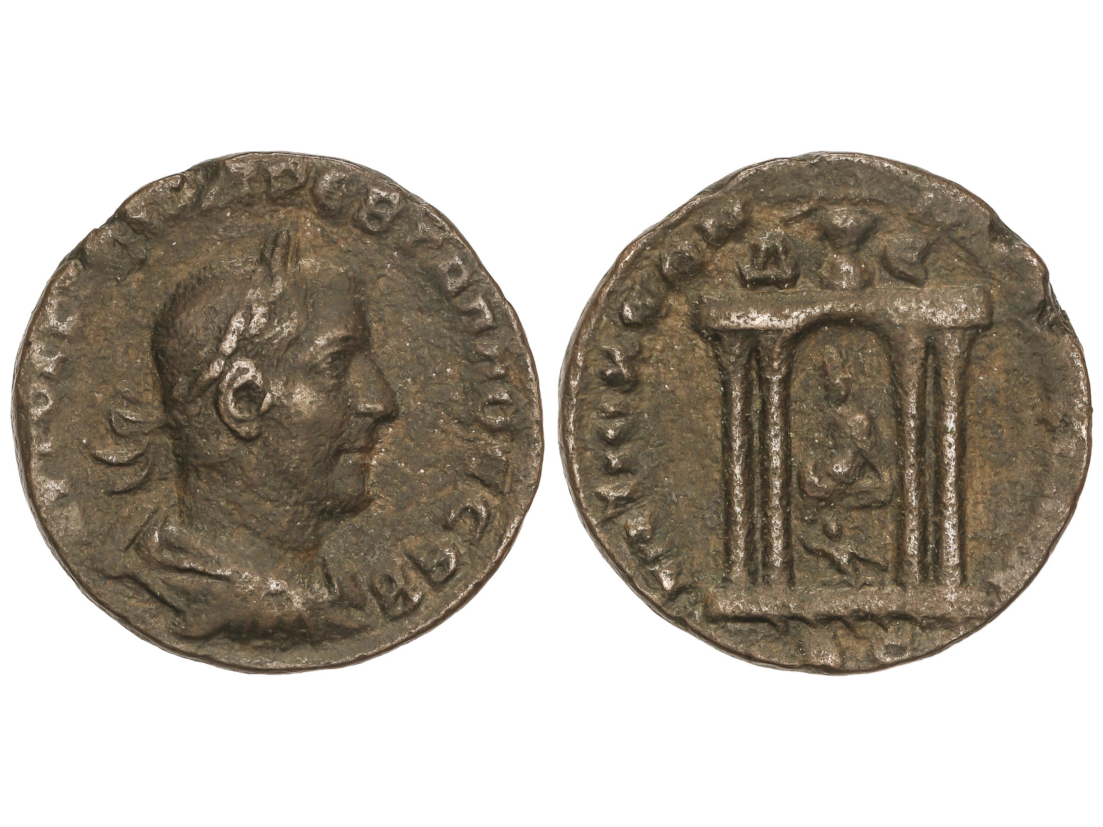Tetradracma. 251-253 d.C. TREBONIANO GALO. SELEUCIS Y PIERIA. Rev.: Estatua de culto de Tyche de Antioquía sedente de frente con el dios del río Orontes a los pies dentro de la fachada de templo tetrástilo.