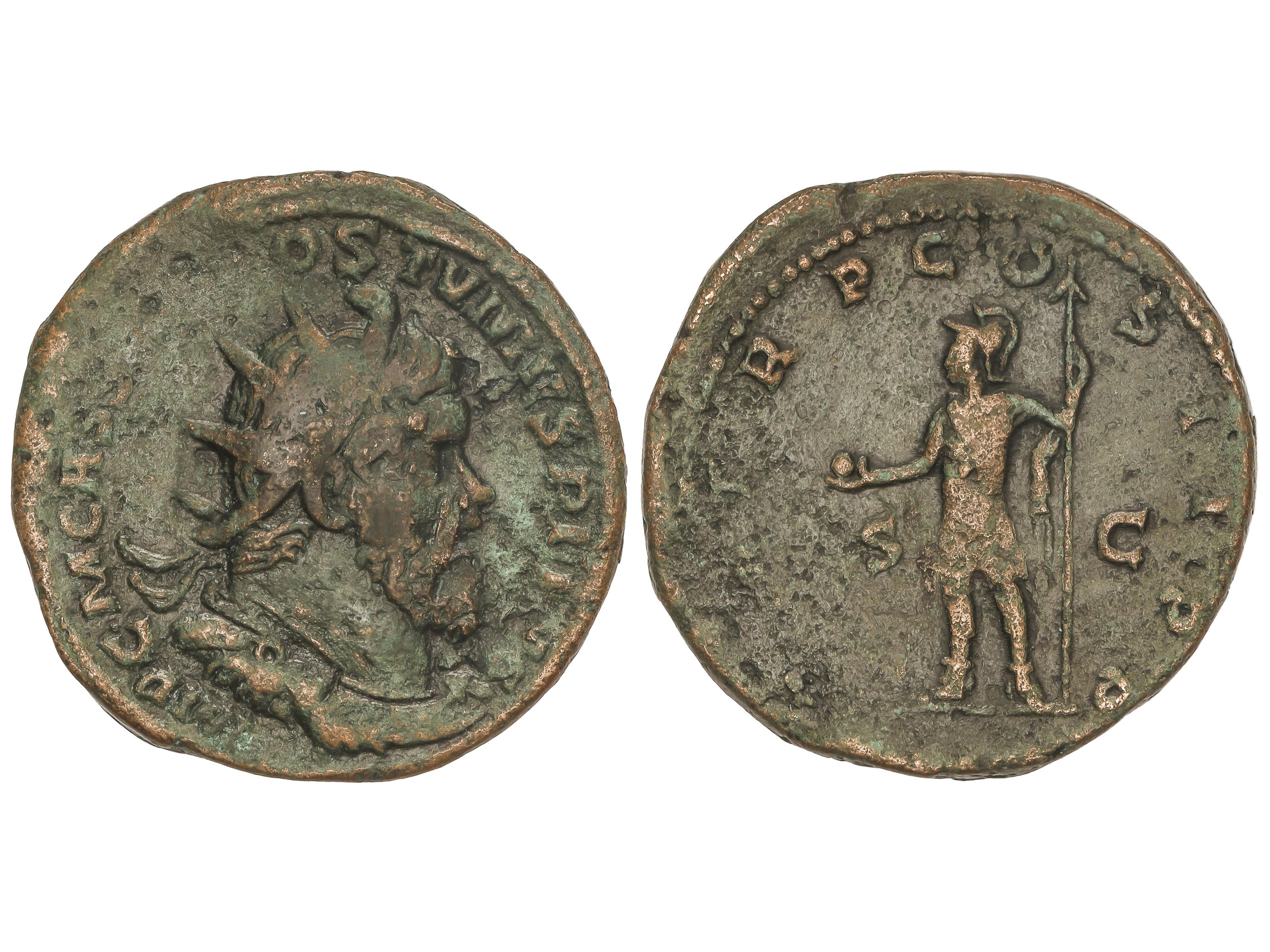 Sestercio. 260 d.C. POSTUMO. Anv.: IMP. C. M. C(ASS. LAT. P)OSTVMVS P. F. AVG. Busto radiado a derecha. Rev.: P. M. TR. P. COS. II P. P. S. C. Póstumo en pie a izquierda. 25,55 grs. AE. (Oxidaciones). Pátina oscura.