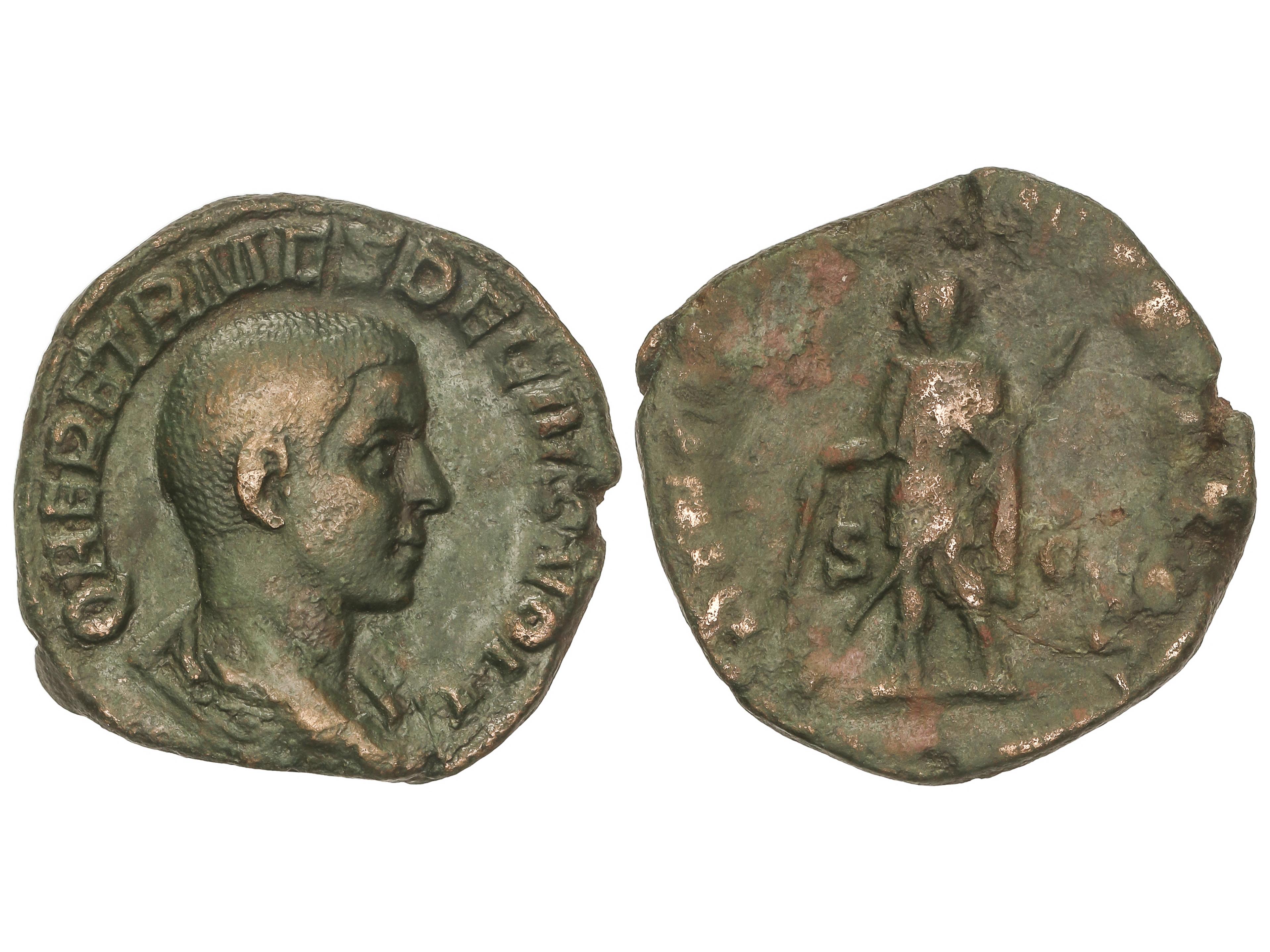 Sestercio. 250-251 d.C. HERENNIO ETRUSCO. Anv.: Q. HER. ETR. MES. DECIVS NOB. C. Busto descubierto a derecha. Rev.: (PRINCIPI IVVENTVTIS) S. C. Herennio en atuendo militar en pie a izquierda, con vara y lanza. 19,80