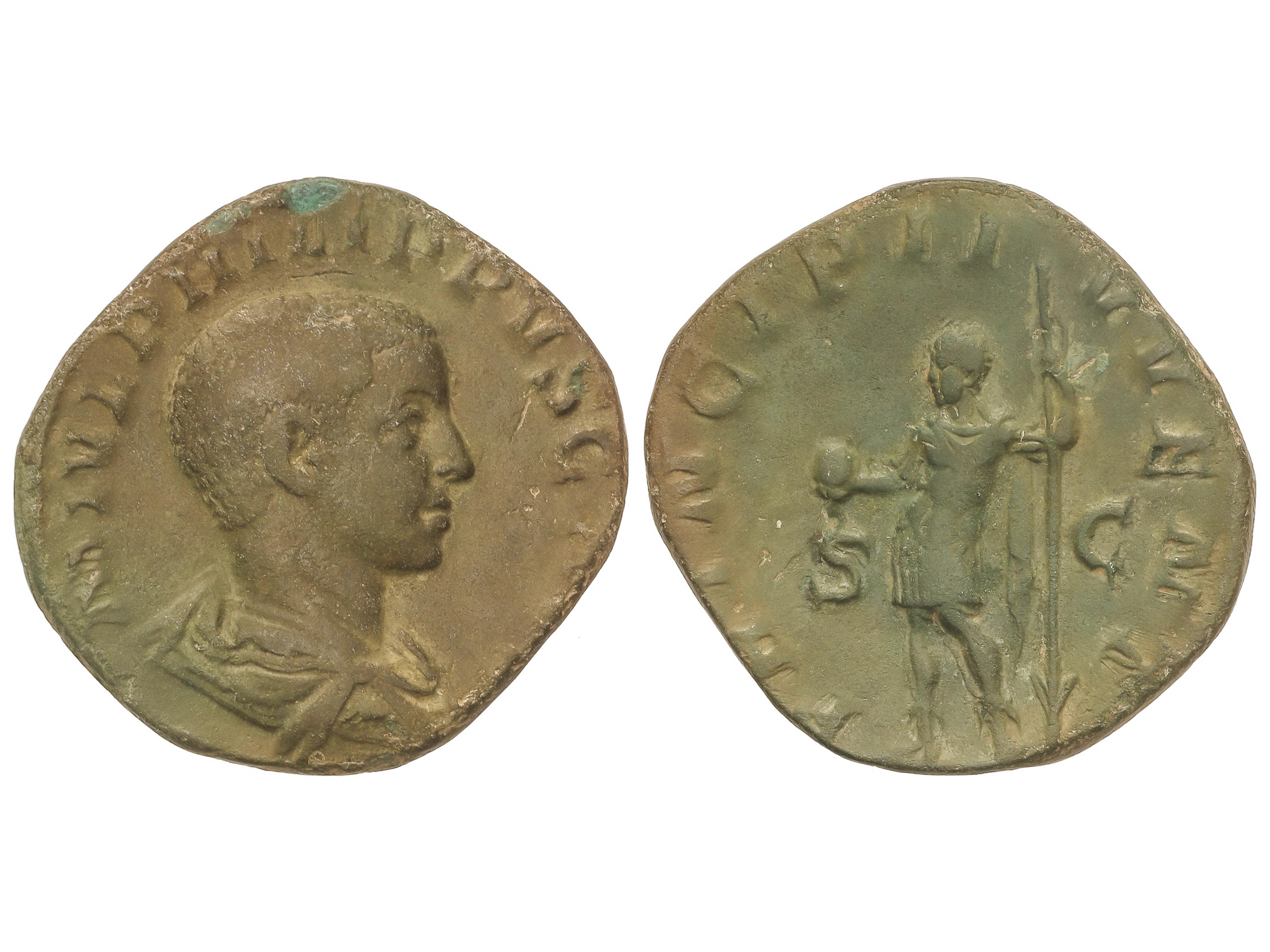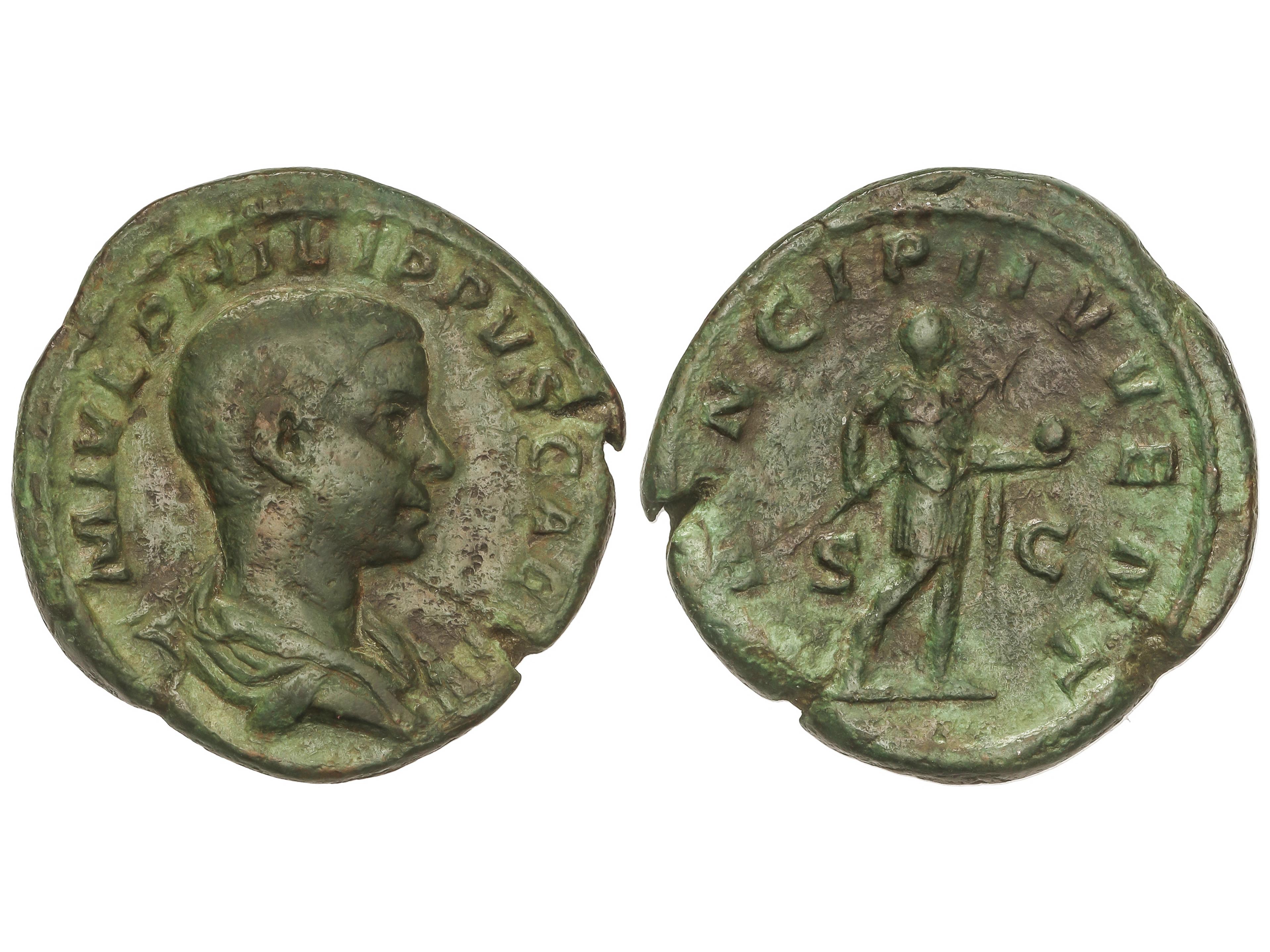Sestercio. 245-246 d.C. FILIPO II. Anv.: M. IVL. PHILIPPVS CAES. Busto drapeado. Rev.: PRINCIPI IVVENT. S.C. Filipo en traje militar sosteniendo lanza transversal y globo. 19,78 grs. AE. Pátina verde. C-55.