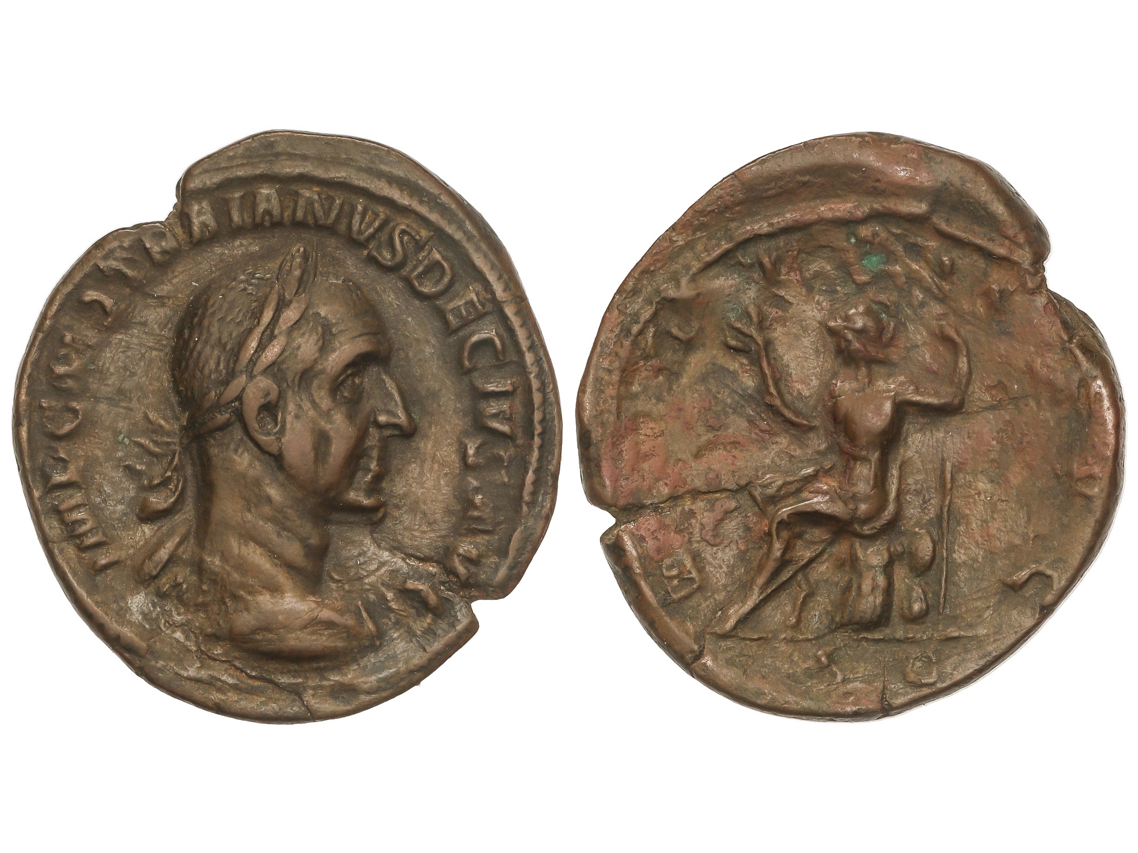 Sestercio. 249-251 d.C. TRAJANO DECIO. Anv.: IMP. C. M. Q. TRAIANVS DECIVS AVG. Su busto laureado y acorazado. Rev.: VIRTVS AVG. S. C. La Valentía sentada a izquierda sobre una coraza, con ramo y cetro. 17,25 grs. AE.