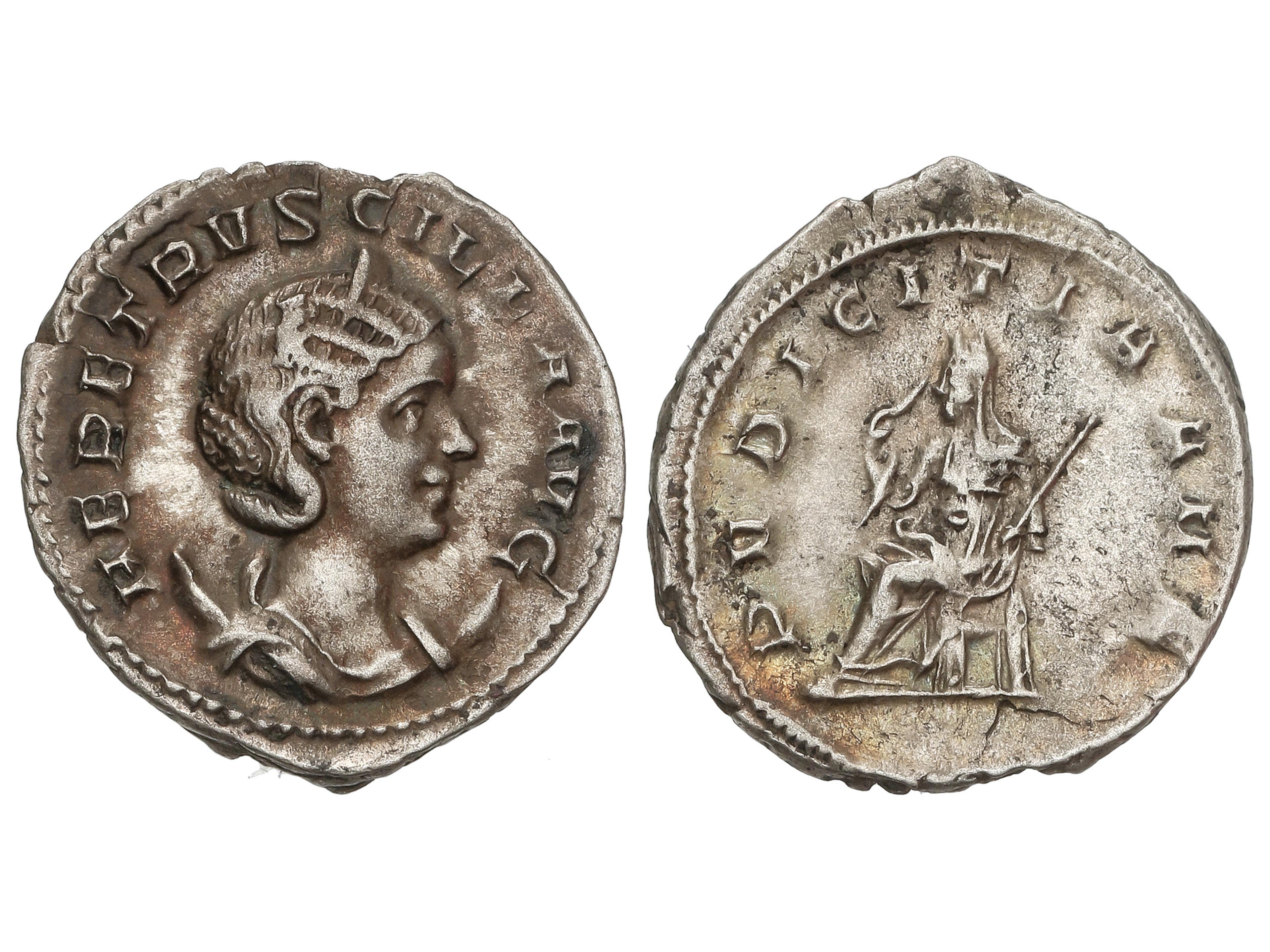 Denario. 249-251 d.C. HERENNIA ETRUSCILLA. Anv.: HER ETRVSCILLA AVG. Busto a derecha. Rev.: PVDICITIA AVG. Pudibundez sendente a izquierda. 3,43 grs. AR. Pátina. C-19; RIC-59. MBC+. (Image1)