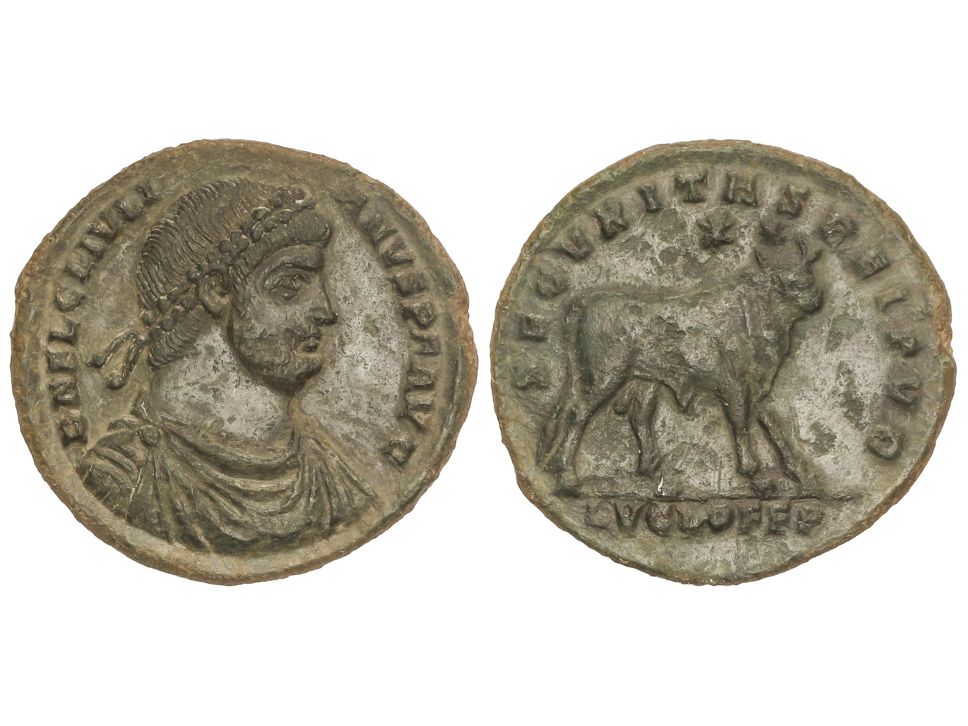 Doble maiorina. 363 d.C. JULIANO II. LYON. Anv.: D. N. FL. CL. IVLIANVS P. F. AVG. Busto barbado a derecha. Rev.: SECVRITAS REI PVB. Toro a derecha, arriba dos estrellas. En exergo: LVGD OFFS. 8,24 grs. AE.