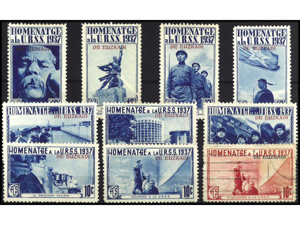 ESPAÑA GUERRA CIVIL. HOMENAJE A LA U.R.S.S. 9 Sellos en color azul y uno en rojo con Sob. EUZKADI. MUY RAROS. GG.1739/47. (Image1)