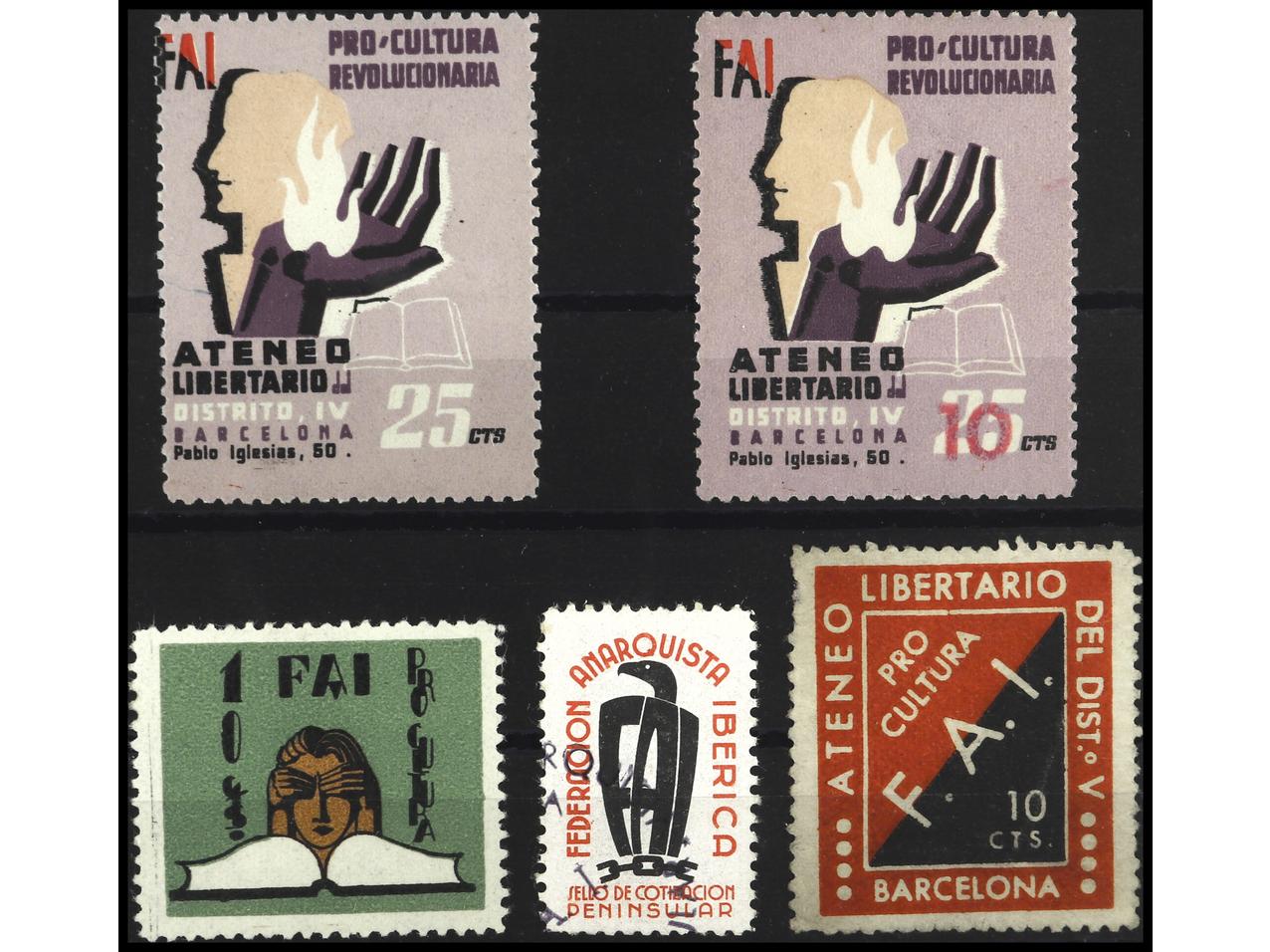 ESPAÑA GUERRA CIVIL. FEDERACIÓN ANARQUISTA IBÉRICA. Lote de 5 sellos. BONITO. MUY RARO. GG.1852/6. (Image1)