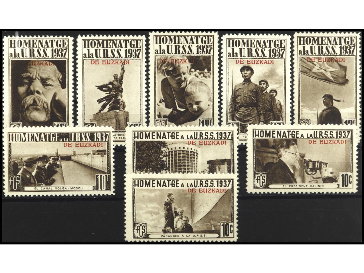 ESPAÑA GUERRA CIVIL. HOMENAJE A LA U.R.S.S. 9 Sellos en color marrón con Sob. EUZKADI. MUY RAROS. GG.1739/48. (Image1) (Image2)