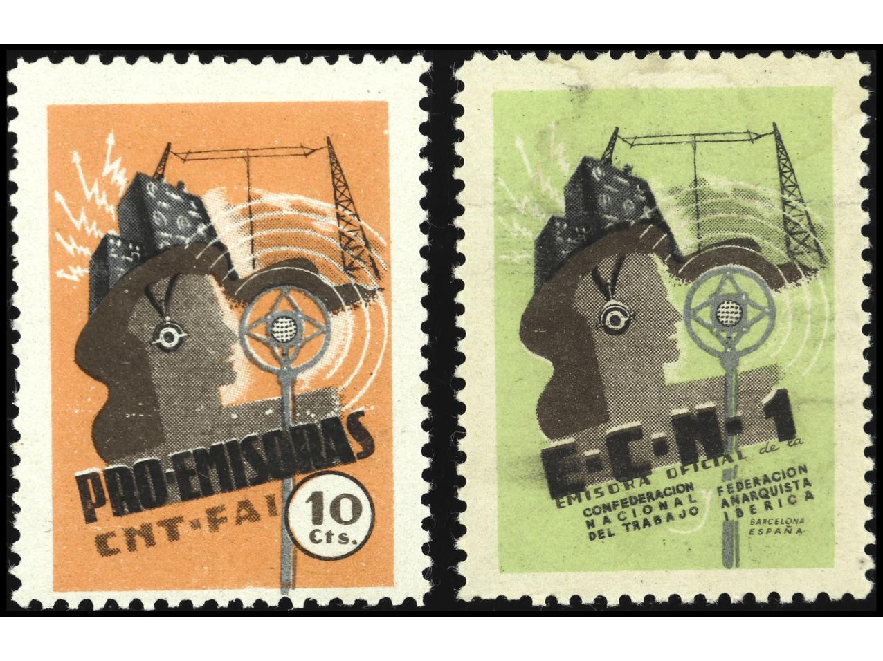 ESPAÑA GUERRA CIVIL. PRO EMISORAS C.N.T. - F.A.I. 10 cts. y 1 pta. PRECIOSOS. RAROS. GG.1874 y 1876. (Image1) (Image2)