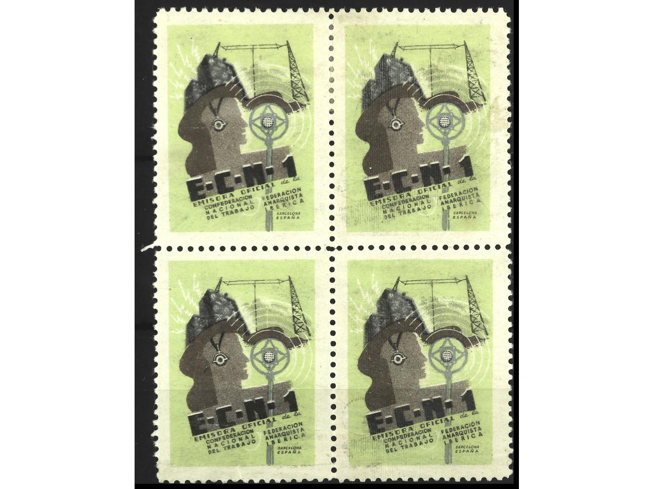 ESPAÑA GUERRA CIVIL. C.N.T. - F.A.I. EMISORA OFICIAL. 1 pta. en bloque de 4. RARO. GG.1876. (Image1)