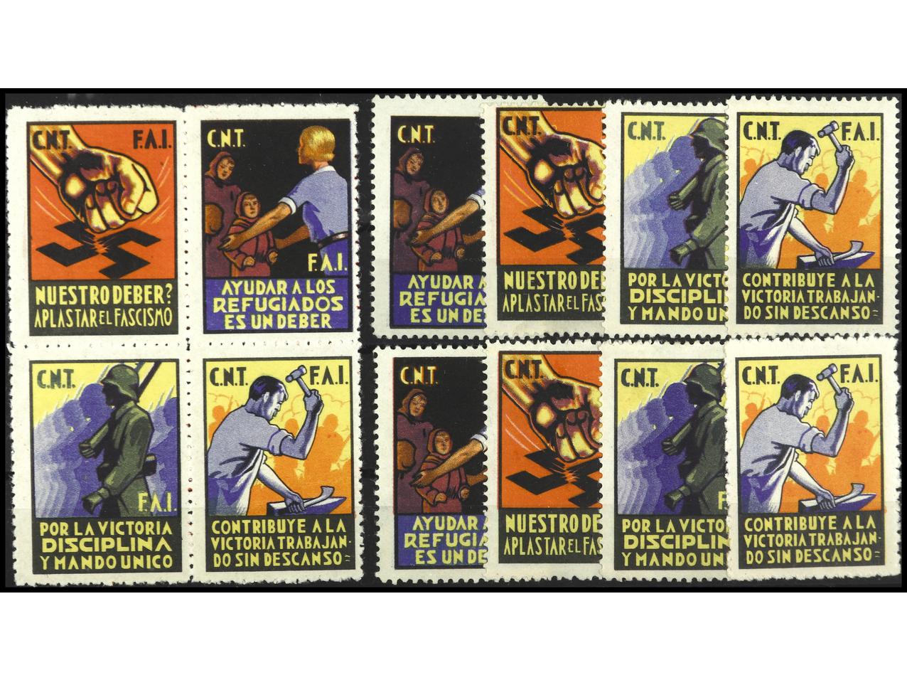 ESPAÑA GUERRA CIVIL. C.N.T. - F.A.I. Serie con distintos dentados y en bloque de 4. RAROS. GG.1883/90. (Image1)