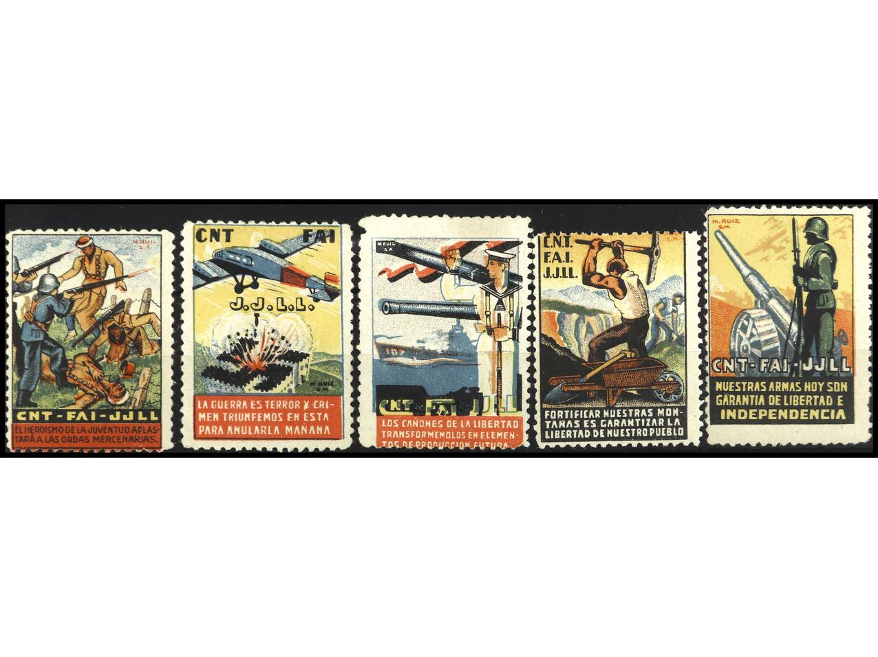 ESPAÑA GUERRA CIVIL. C.N.T.-F.A.I.-J.J.L.L. 5 Sellos. PRECIOSOS. MUY RAROS. GG.1903/4, 1907 y 1909/10. (Image1)