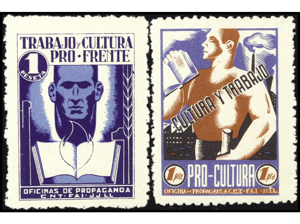 ESPAÑA GUERRA CIVIL. C.N.T. - F.A.I. - J.J.L.L. PRO CULTURA. 2 Sellos de 1 pta. PRECIOSOS. RAROS. GG.1911/2. (Image1)