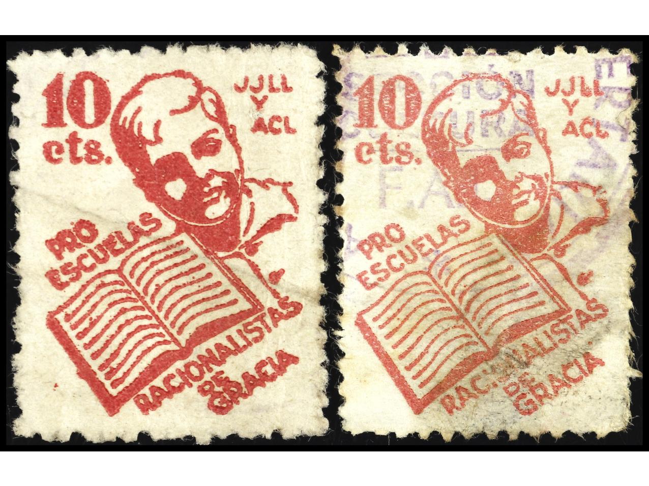 ESPAÑA GUERRA CIVIL. J.J.L.L. - A.C.L. PRO ESCUELAS. 2 Sellos con diferentes tonos. RAROS. GG.1953. (Image1)