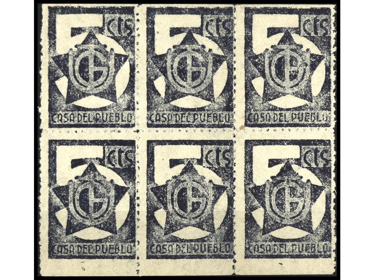 ESPAÑA GUERRA CIVIL. U.G.T. 5 cts. azul en bloque de 6. PRECIOSO. RARO. GG.1987. (Image1)