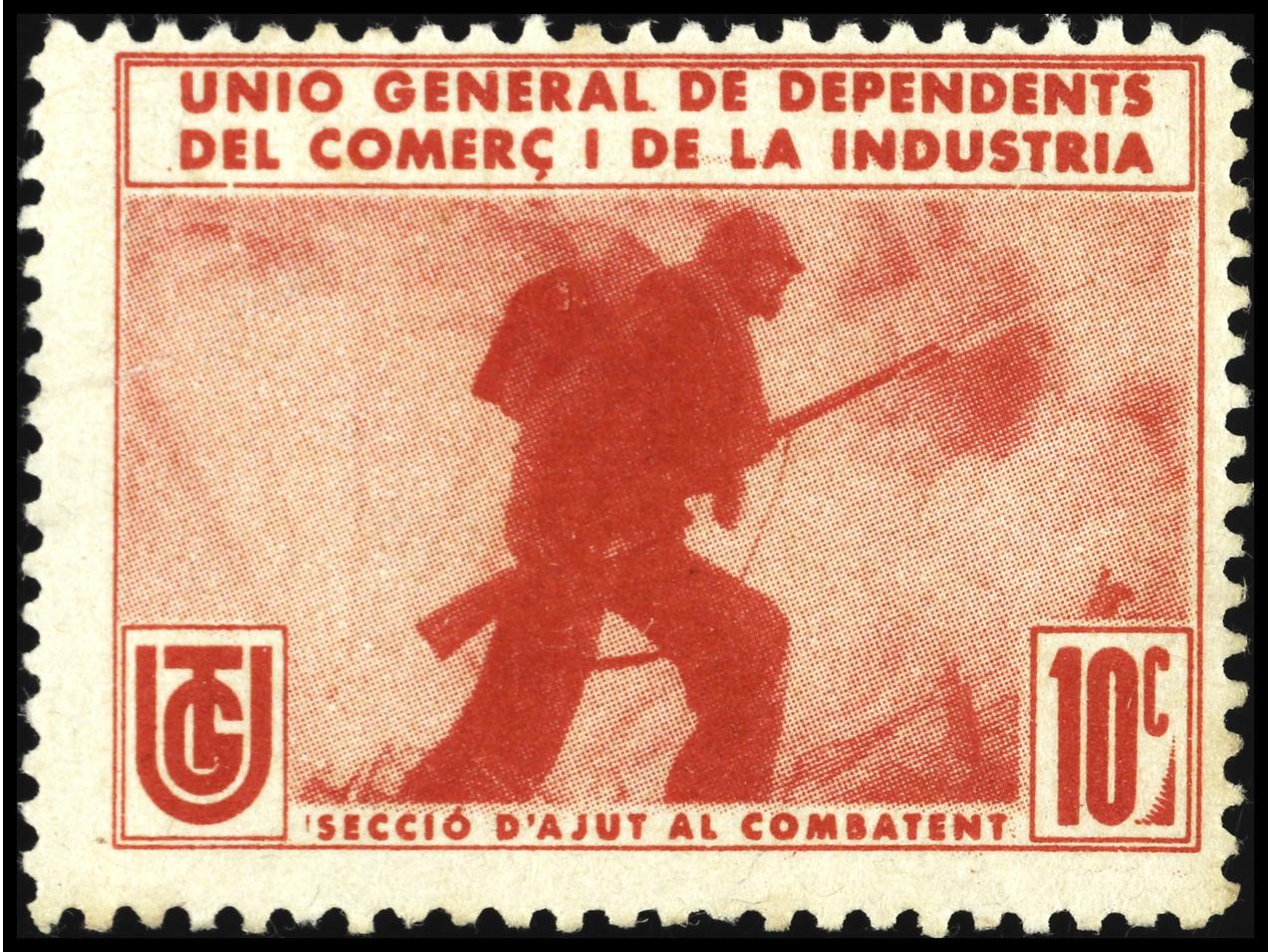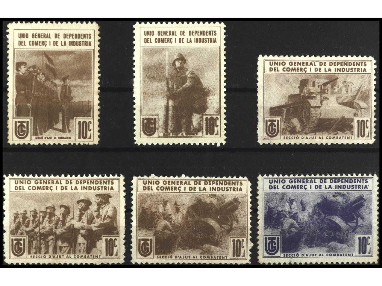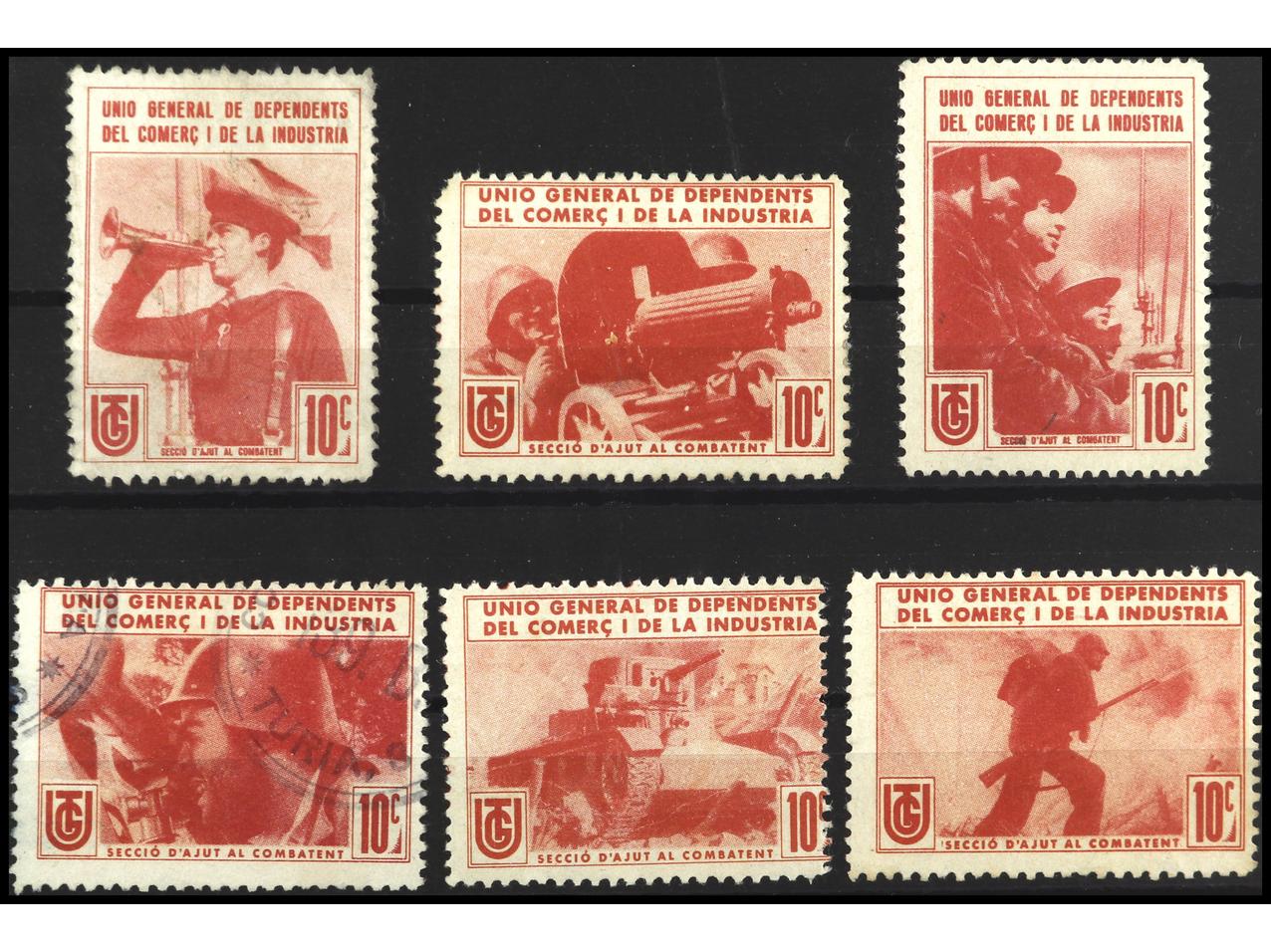 ESPAÑA GUERRA CIVIL. UNIÓN GENERAL DE DEPENDIENTES DEL COMERCIO Y DE LA INDUSTRIA. 6 Sellos en color rojo. Precioso conjunto. MUY RARO. GG.2015.