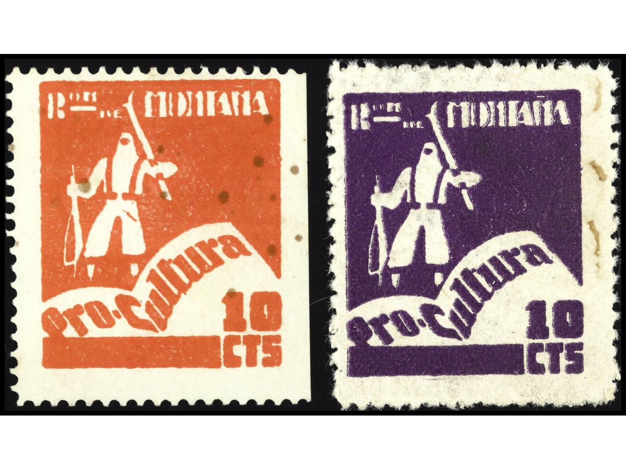 ESPAÑA GUERRA CIVIL. PRO CULTURA. BATALLÓN DE MONTAÑA. 2 Sellos de 10 cts. en rojo y violeta. MUY RAROS. GG.2093. (Image1)