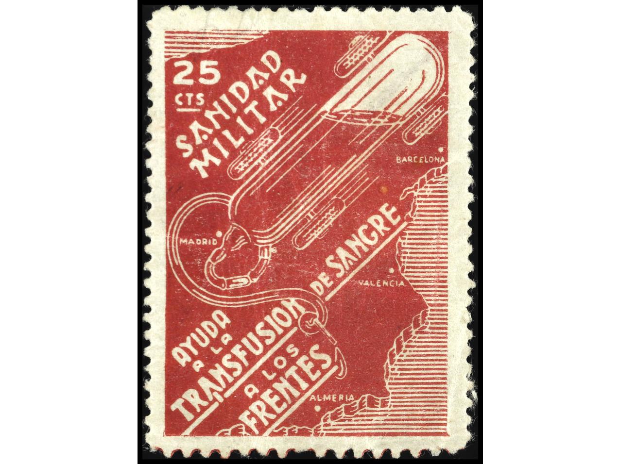 ESPAÑA GUERRA CIVIL. AYUDA A LA TRANSFUSIÓN DE SANGRE A LOS FRENTES. 25 cts. rojo. MUY RARO. GG.2129. (Image1)