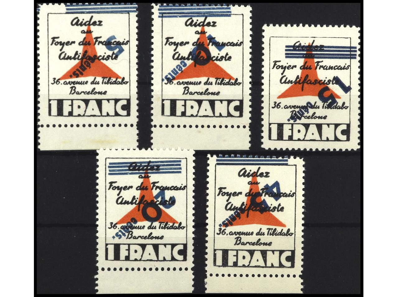 ESPAÑA GUERRA CIVIL. FOYER DU FRANCAIS ANTIFASCISTA. 5 Sellos con HAB. INVERTIDA. PRECIOSOS. MUY RAROS. GG.2190a/6a. (Image1) (Image2)