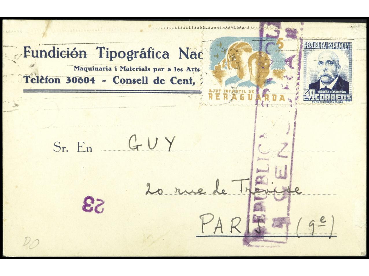 ESPAÑA GUERRA CIVIL. AYUDA INFANTIL DE RETAGUARDIA. Tarjeta postal de BARCELONA a PARIS. PRECIOSA. MUY RARA. GG.2290. (Image1)
