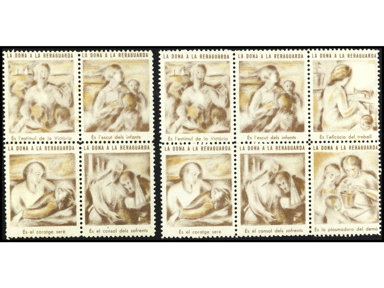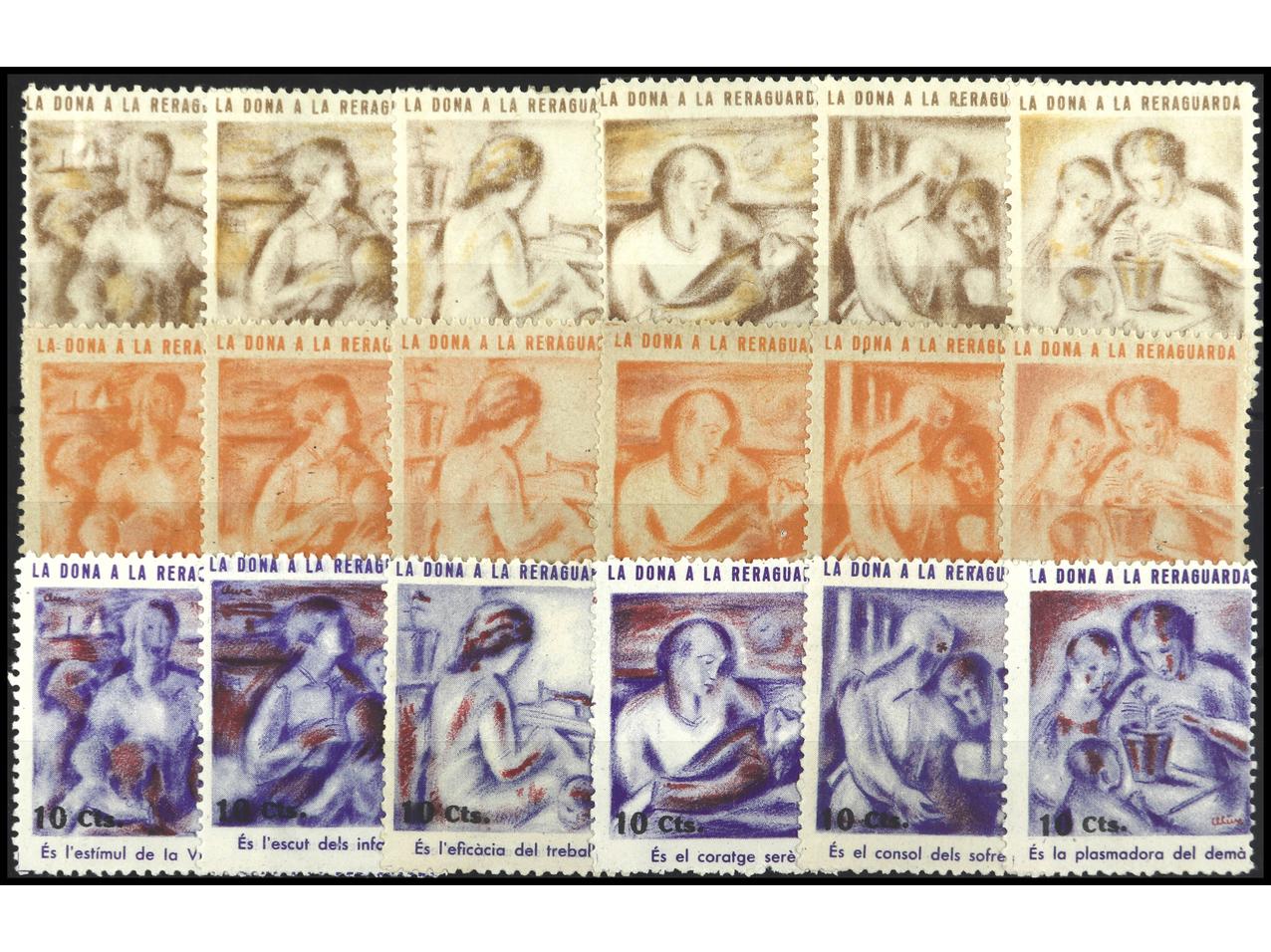 ESPAÑA GUERRA CIVIL. LA DONA A LA RERAGUARDA. 3 SERIES COMPLETAS más 2 bloques de 4 de 6. MUY RAROS. GG.2310/27. (Image1) (Image2)