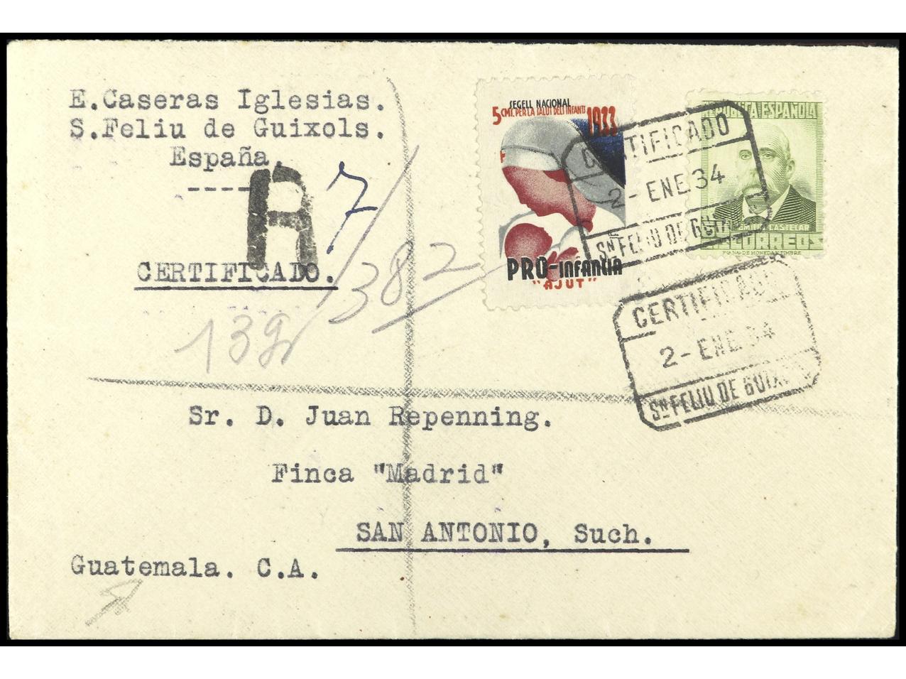 ESPAÑA GUERRA CIVIL. Carta certificada de SAN FELIU DE GUIXOLS a GUATEMALA, enviada el 2 Ene. 1934 y llegada el 2 Feb. (al dorso). PRECIOSA. MUY RARA. GG.2282.