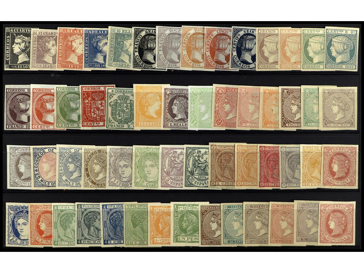 1869 ng imageESPAÑA. FALSOS FILATÉLICOS. Lote de 56 falsos diferentes montado en 2 fichas grandes. 2 De cada (total 112 piezas). También hay de Colonias Españolas. A EXAMINAR. (Image1) (Image2) (All Images)