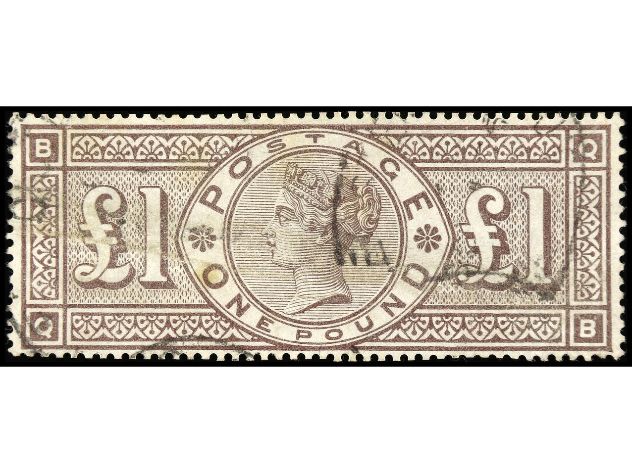 GRAN BRETAÑA. 1 libra castaño lila. Centrado de LUJO. Doblez diagonal y sombra del tiempo. MAGNÍFICO ASPECTO. MUY RARO. Yv.89, S.G. 185. Cat. 2.200€.
