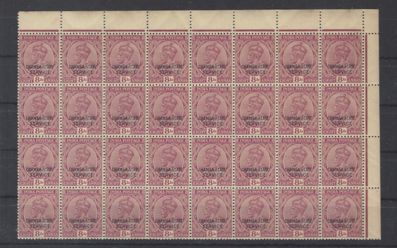 411 nh imageCHAMBA, #O43, "8 a. Red Violet," UR Corner Margin Blk. of 32 Stamps, 1930 Issue, Sound Cond., OG, MNH, F-VF, Est. SCV is $800.00 (Image) 800.00E