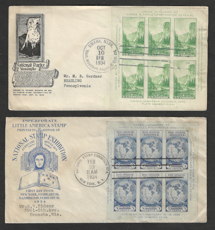 213 c image740-749 (10), "National Parks" (1934 Issue), 8 Diff. Cmpt. Sets of F.D.C.'s, All with Printed Cachets, Two Sets with Blks. of 4, Two Sets with Washington D.C. Cancels, Sound Cond., F-VF, SCV is About $1,000.00 (Image) (image2) (image3) (image4) (All Images)