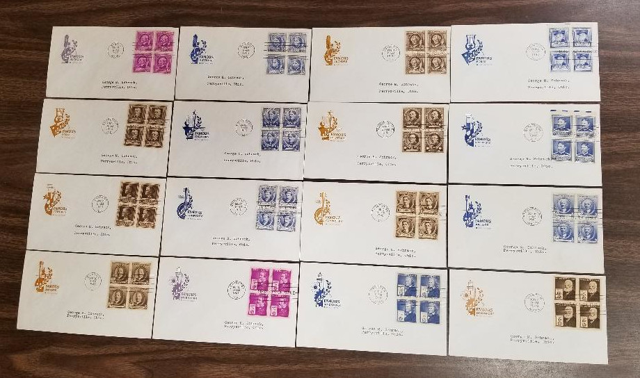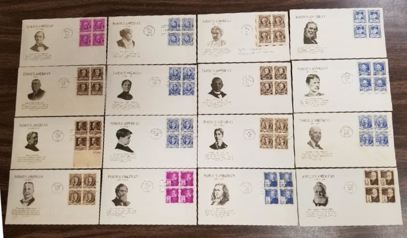 218 c image850-893 (35), "Famous Americans," 1940 Issue, Four Diff. Cmpt. Sets of Cacheted F.D.C.'s, Includes Two Sets with Blks. of 4, Sound Cond., F-VF, SCV is About $700.00 (Image) (image2) (image3) (image4) (All Images)